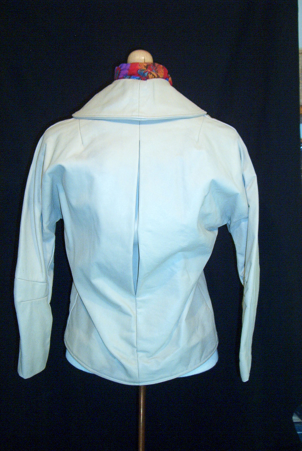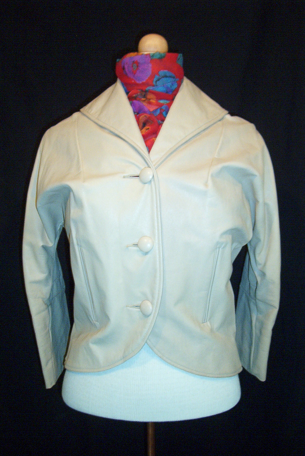 In the 1950’s, jackets became more sporty and body-conscious in many cases. This fitted white leather jacket is a great example. Covered buttons, a wide collar, slash pockets and back vent really draw the eye. It’s sleek and streamlined. The fitting reflects that in the tapered sleeves and fitted waist. Extra room on top which accents she shoulders and bustline gives a bit of an athletic or “va-va-voom” figure enhancement. Love it!
