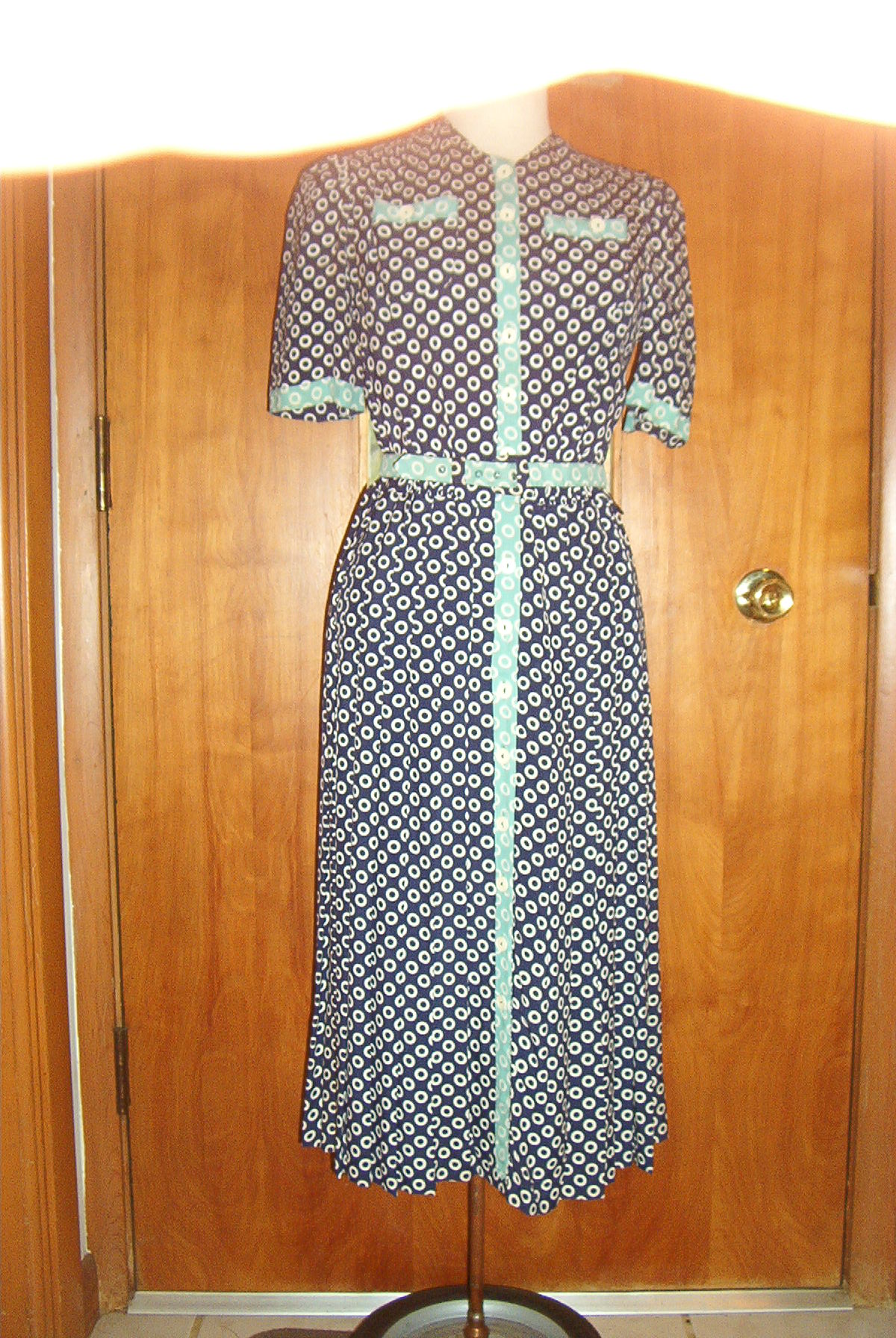 A knee-length synthetic (probably acetate blend) coral red frock from the early 1940’s has augmented shoulders, a straight cut and a fabric-covered belt with some glass beads to dress it up. In the post-war Forties, hemlines were able to come down again and skirts became fuller. The knee-length wartime styles were able to resume their previous midi-length luxury. Rayons and polyester synthetics continued their popularity because of their availability, lovely drape and acceptance of color dyes. During the early recovery from the war, some natural fabrics and detail items were still not fully stocked in dressmaking supplies.
