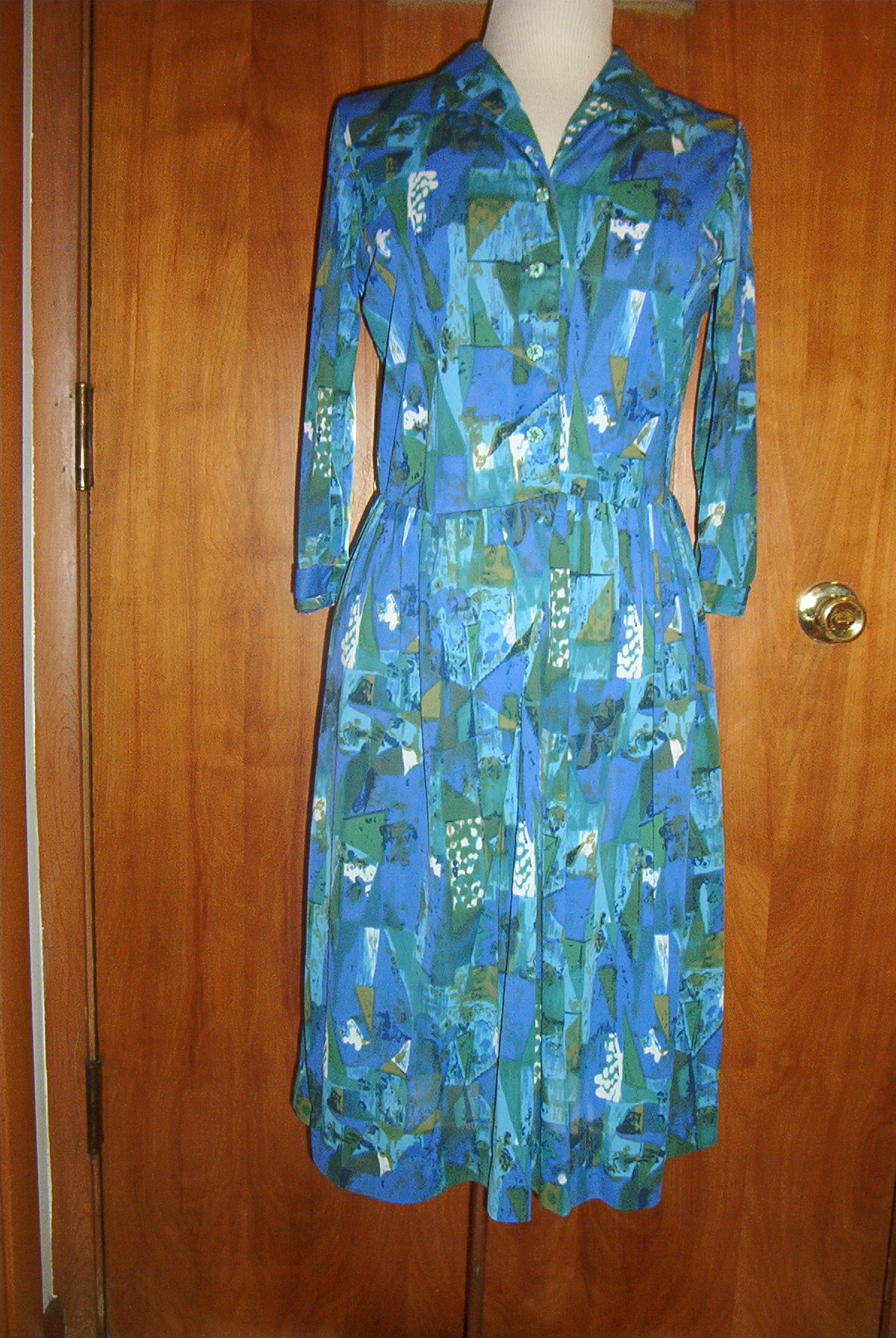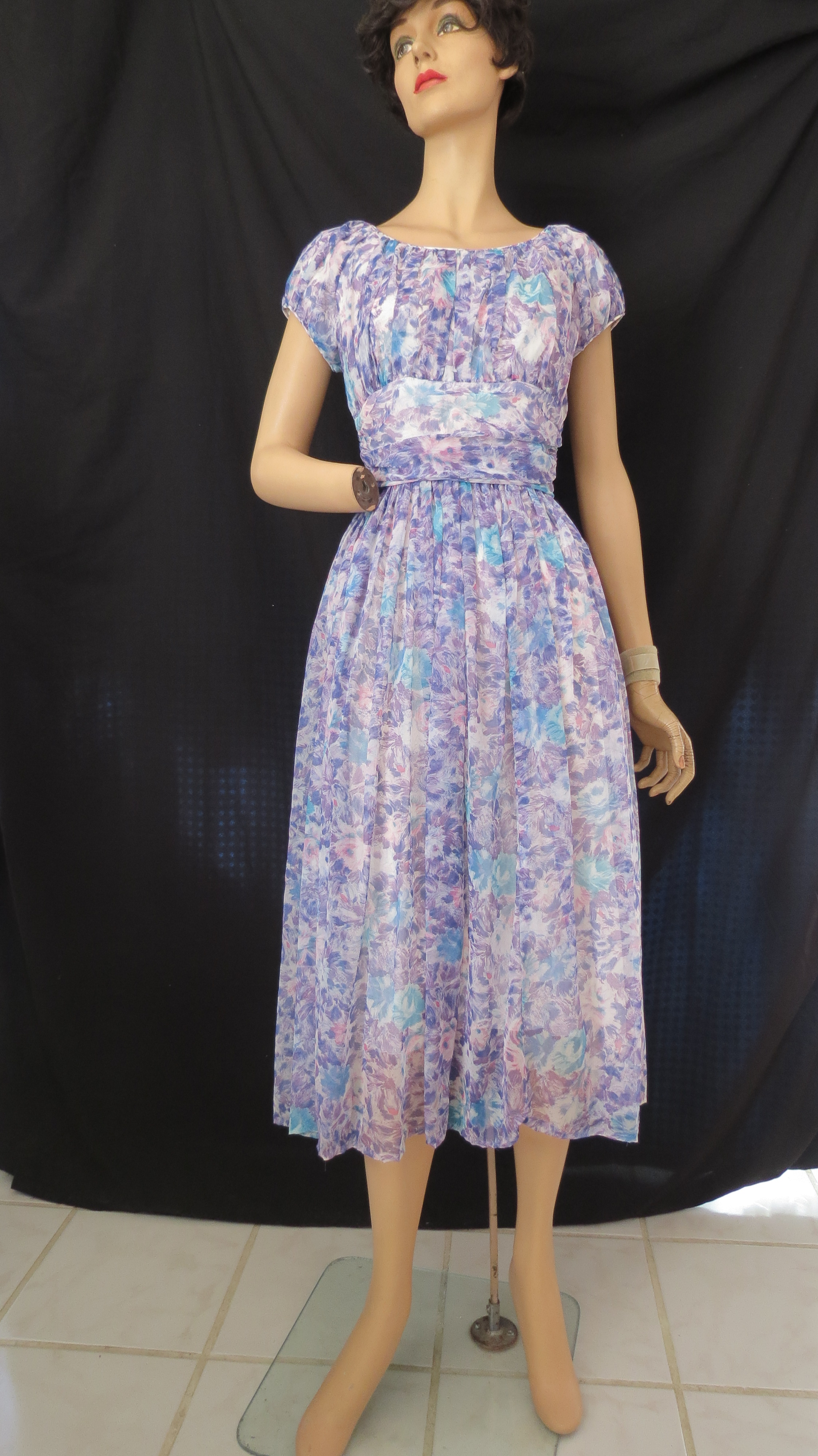 The ever-popular shirtwaist style has never left the fashion scene but became more modern, with atomic prints, and more sophisticated design in the later ’40’s after women had stepped into more visible roles in society with their wartime efforts. When the majority of the trauma and restrictions were finally past, this tea-length floral frock is an example of a more relaxed, aristocratic style as the culture looked forward to the more prosperous 1950’s.
