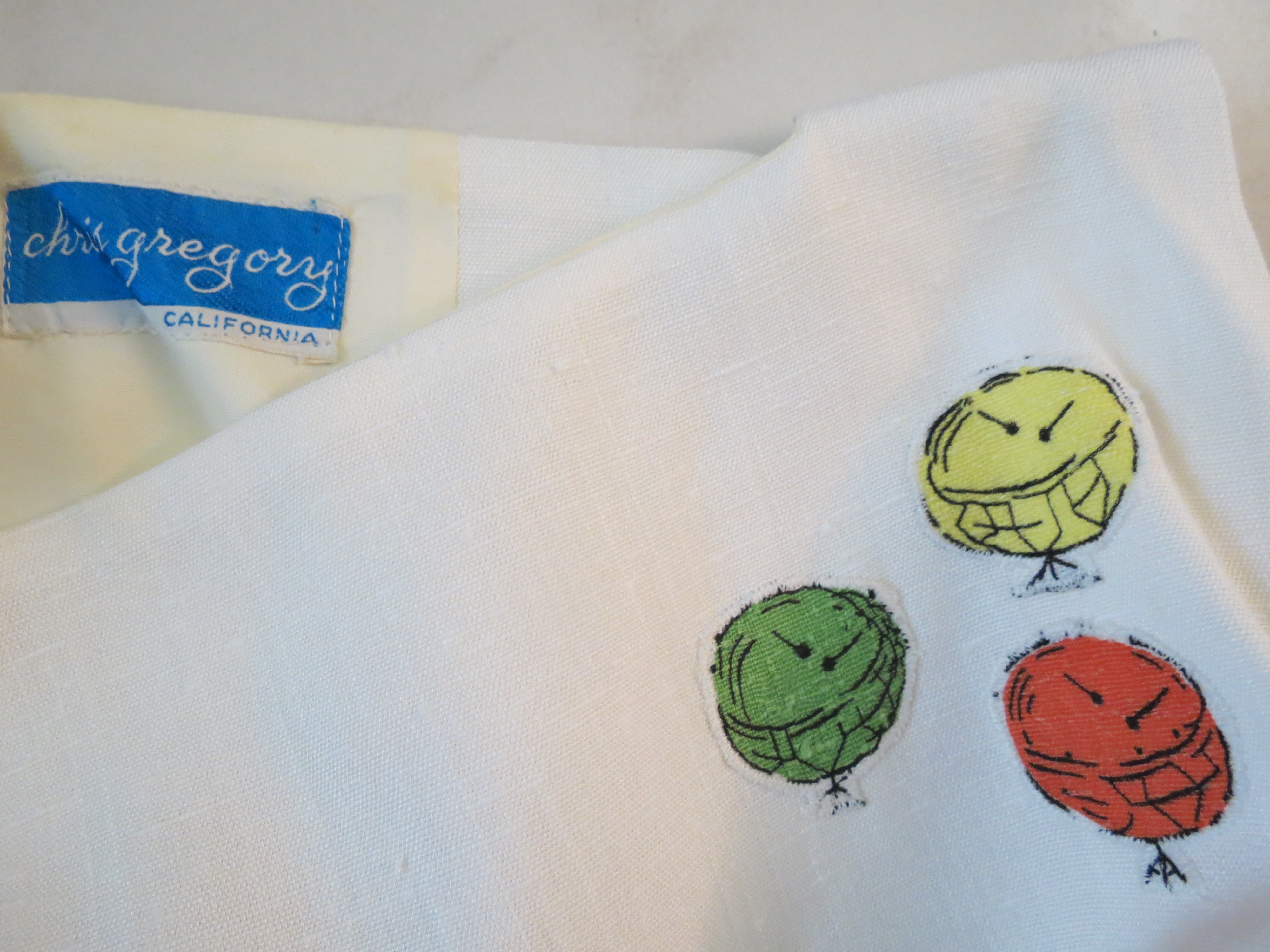 The turtleneck that we love now didn’t seem to show up too much in everyone’s closets until the early 1960’s. Until then, it was a little more avant guarde or unconventional for the average gal though they were on the scene from the 1920’s. Always a sportswear item, especially from the time women began to dress more casually in the 1940’s, women’s sweaters became less dressy. We’d begin to see themed sweaters like this Las Vegas souvenir from the 1970’s or with prominent monograms, mostly in the ’50’s. Of course, many mid-century women knitted and crocheted tons of styles at home, from super-casual to evening styles.
