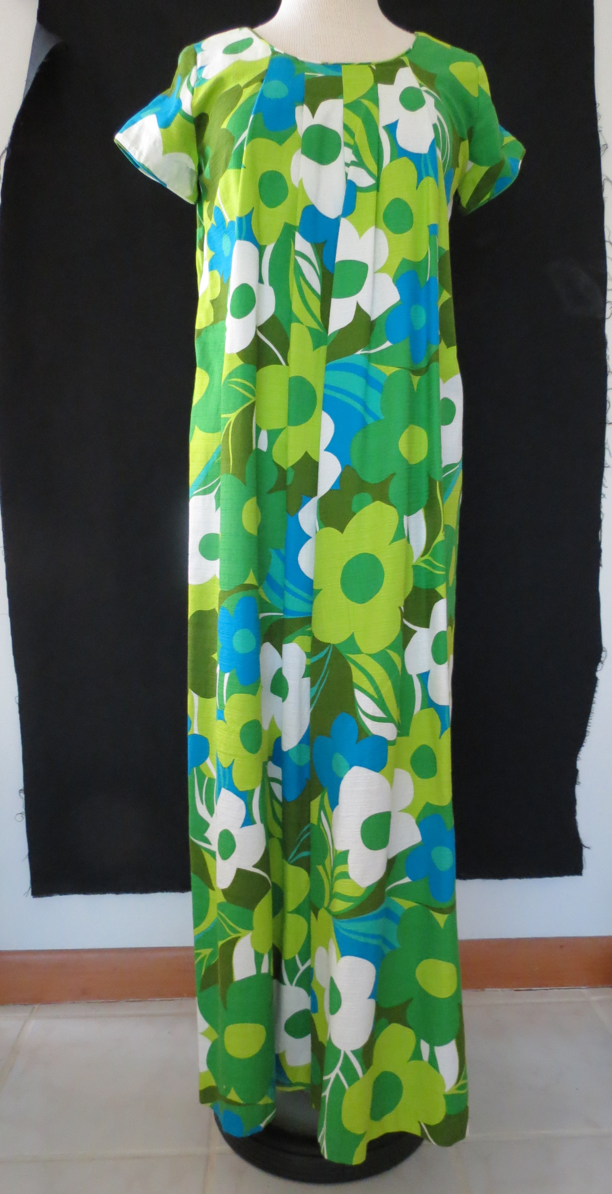 Wow! Our gal’s back home and guess where she went – Honolulu, Hawaii. Looks like she even stayed at the Royal Hawaiian Hotel!! No bargain budget for her, and we can see that in her choice of souvenirs. Two wonderful made-in-Hawaii frocks from the early 1960’s. Remember that blue and green trend from the early ’60’s that I’ve mentioned before? Also, look at the mad, Mod print on the long gown. Fab!