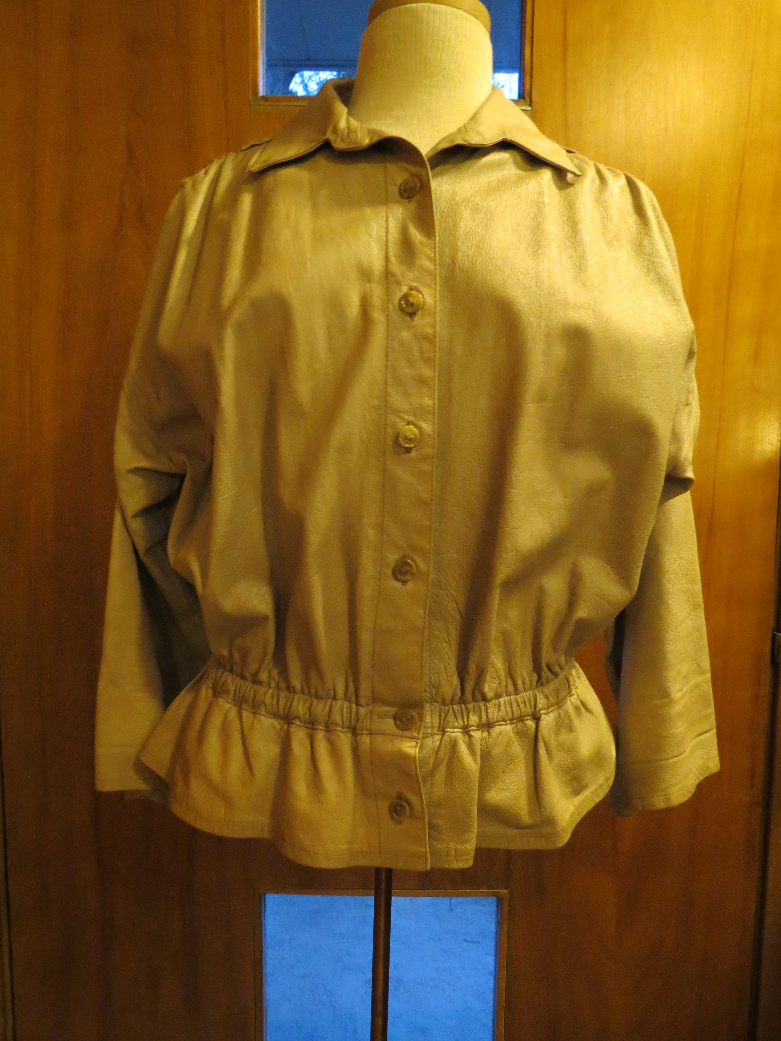 The tan-color 1980’s jacket is also made of leather. It’s a casual style that is more international and eccentric but has a bomber jacket silhouette paired with a 1940’s peplum waist that goes with some types of skirts and pants. Lots of gathers on the shoulders and at the waist give it a roomy fit that lets you wear a sweater underneath if you want to.