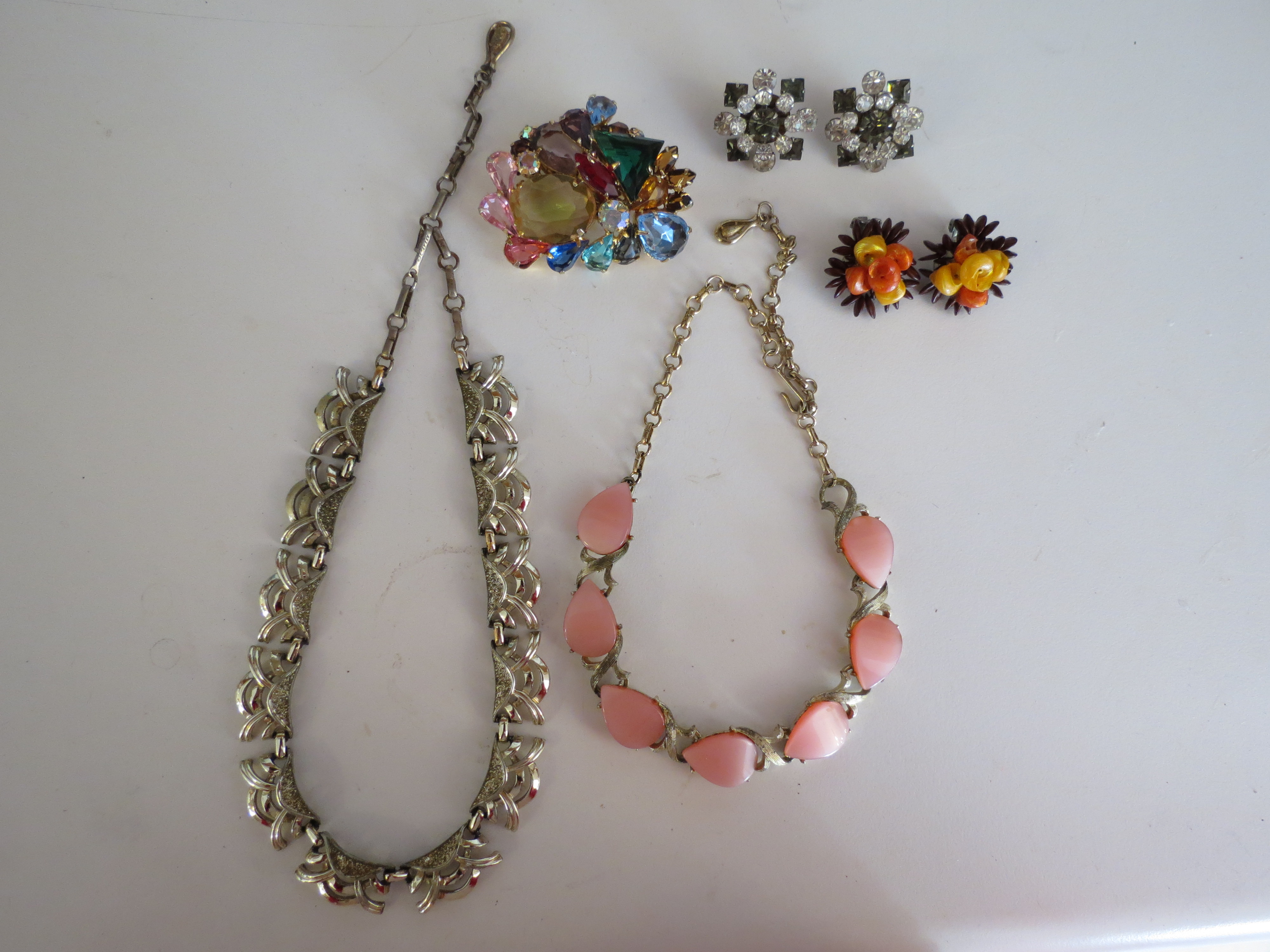 Wasp waists, circle skirts and cap sleeves – 3 style features which are predominant on 1950’s frocks, though many other elements of design appear. The tiny waistline is probably the most frequently seen feature of a Fifties dress. As popular as the synthetic fabrics had become, 100% cotton material was queen of everyday dresses and especially for plaids and stripes which could be woven right into the cloth. Prints were still very evident, such as the blue and aqua shirtdress above, with a cute Paris, France motif (special to me because it belonged to a family member). A variation of the open-toe, low-heel sandal shown yesterday would have gone very well with these dresses, too. Colorful dresses called for fun and affordable costume jewelry, which abounded in the ’50’s. Made from pot metal, glass and plastic, every gal could afford a little bling with every outfit. Natural materials were sometimes used, too. Our mid-century gal who returned from Hawaii a few days ago, might have brought home a pair of souvenir earrings made from seeds and shells.