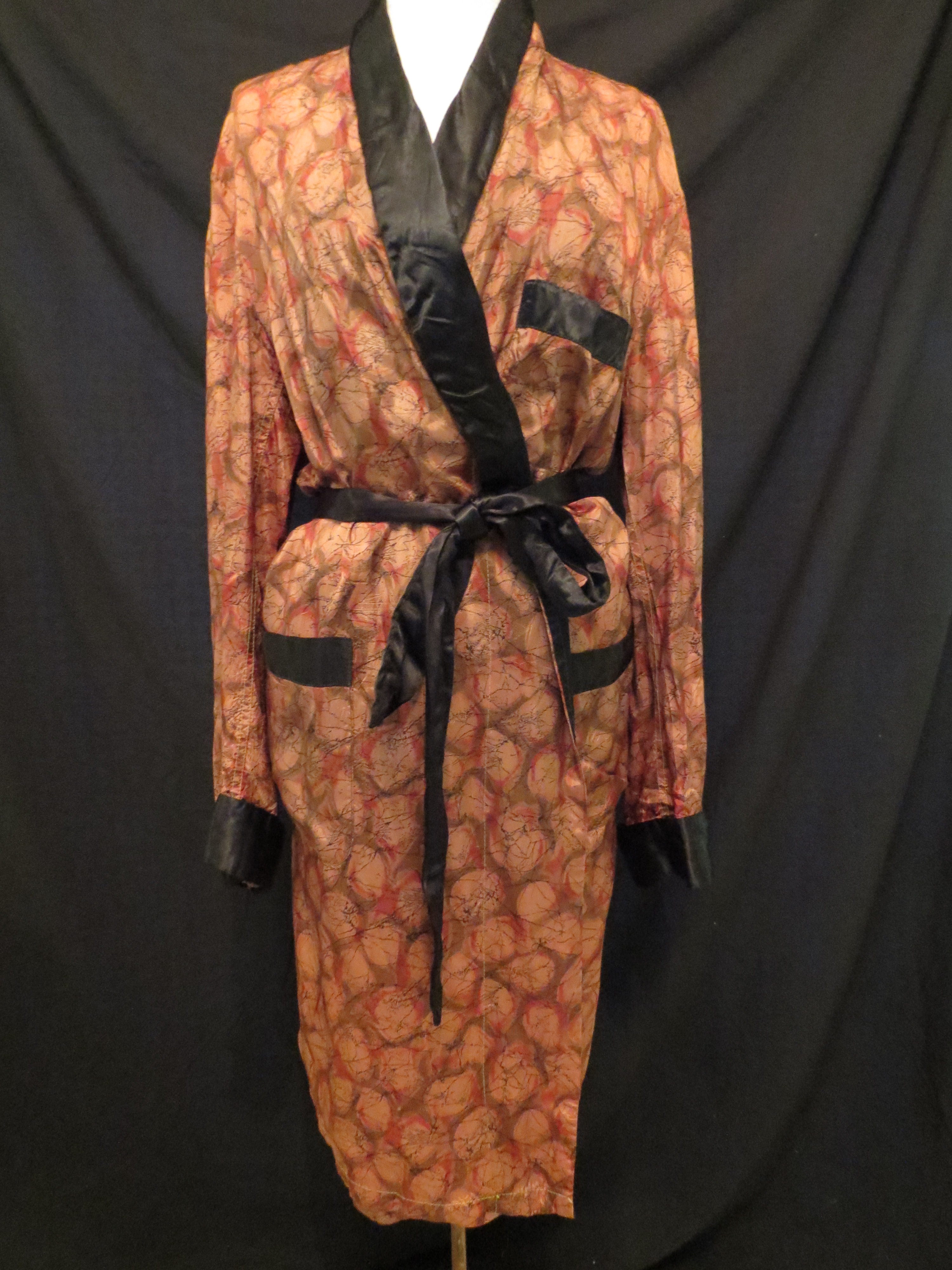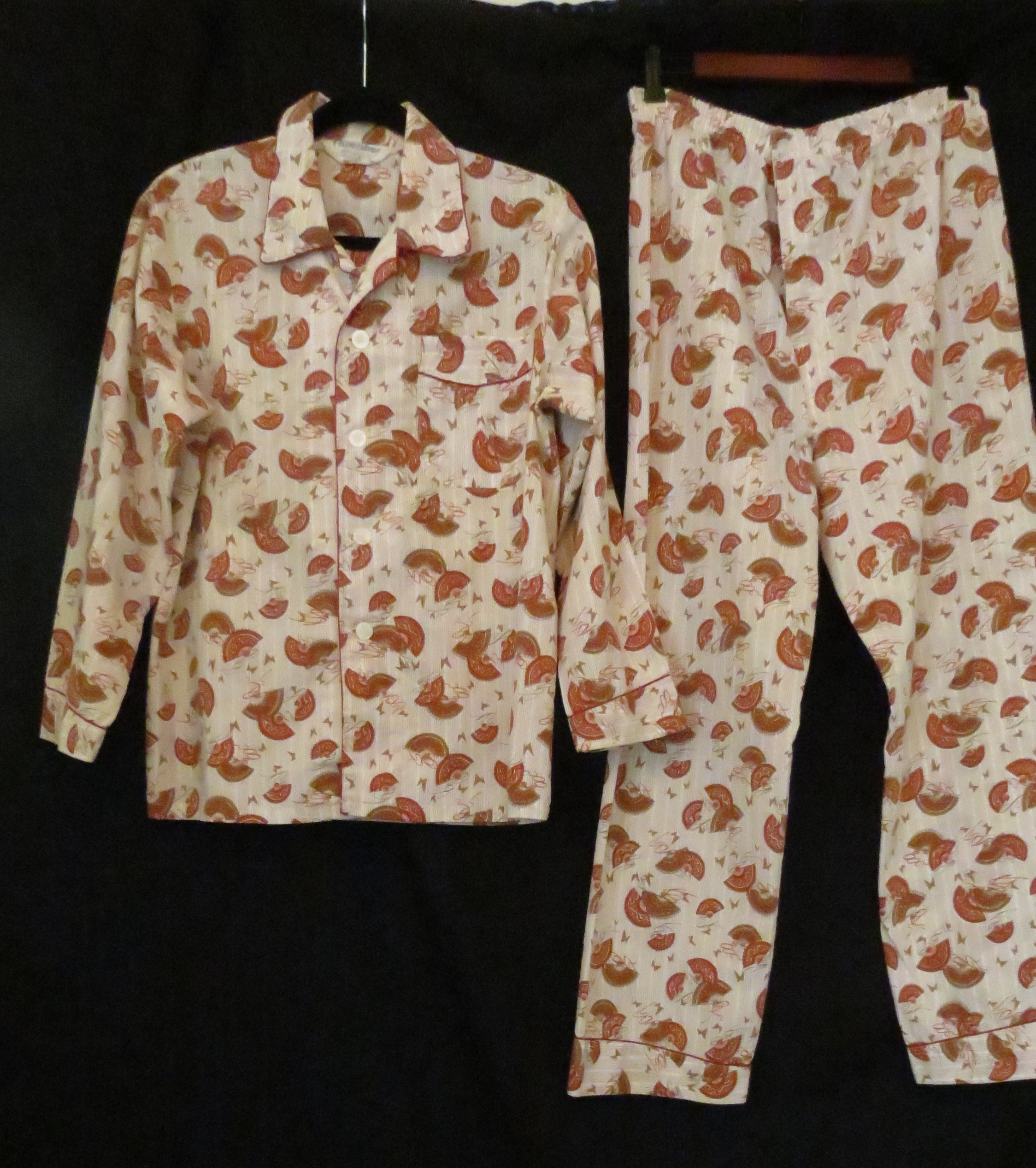 For the men, a swanky rayon bathrobe makes any guy an instant sophisticate. Abstract medallion print with satin trim. How aristocratic! As for the PJs, cotton print men’s pajamas from the 1940’s and 1950’s are so wonderful. Of course, they wear to cozy softness but the real star of the scene is the art prints that many of them displayed. This pair have stylized hand fans all over – an unusual motif for men’s PJs, but that’s what they are. Both pieces show the standard tailoring for men’s garments, though it’s fun for women to wear them, too.