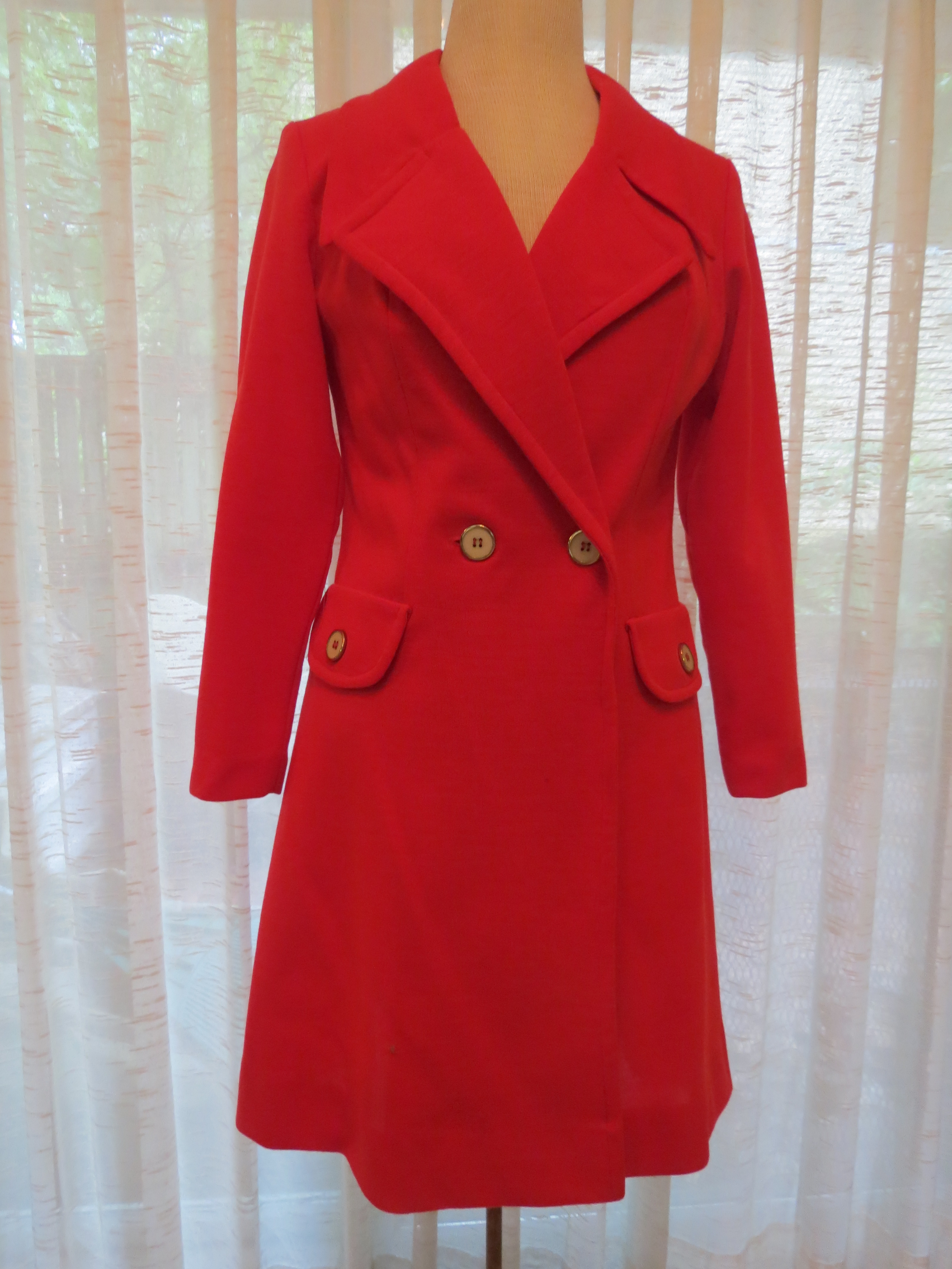 The bright red all-weather textured polyester coat from the 1970’s has many mid-century style features. The stand-out collar design with extended lapels is a “1970’s does 1940’s” style which was very popular in the early Seventies. The fitted Princess cut also harks back to the 1940’s and 1950’s, up through the early 1960’s because it is very classic. Knee-length hemlines on coats reflected the hemlines on skirts and dresses, so were shorter during WWII and the mini-skirt era between the early ’60’s and early ’70’s.