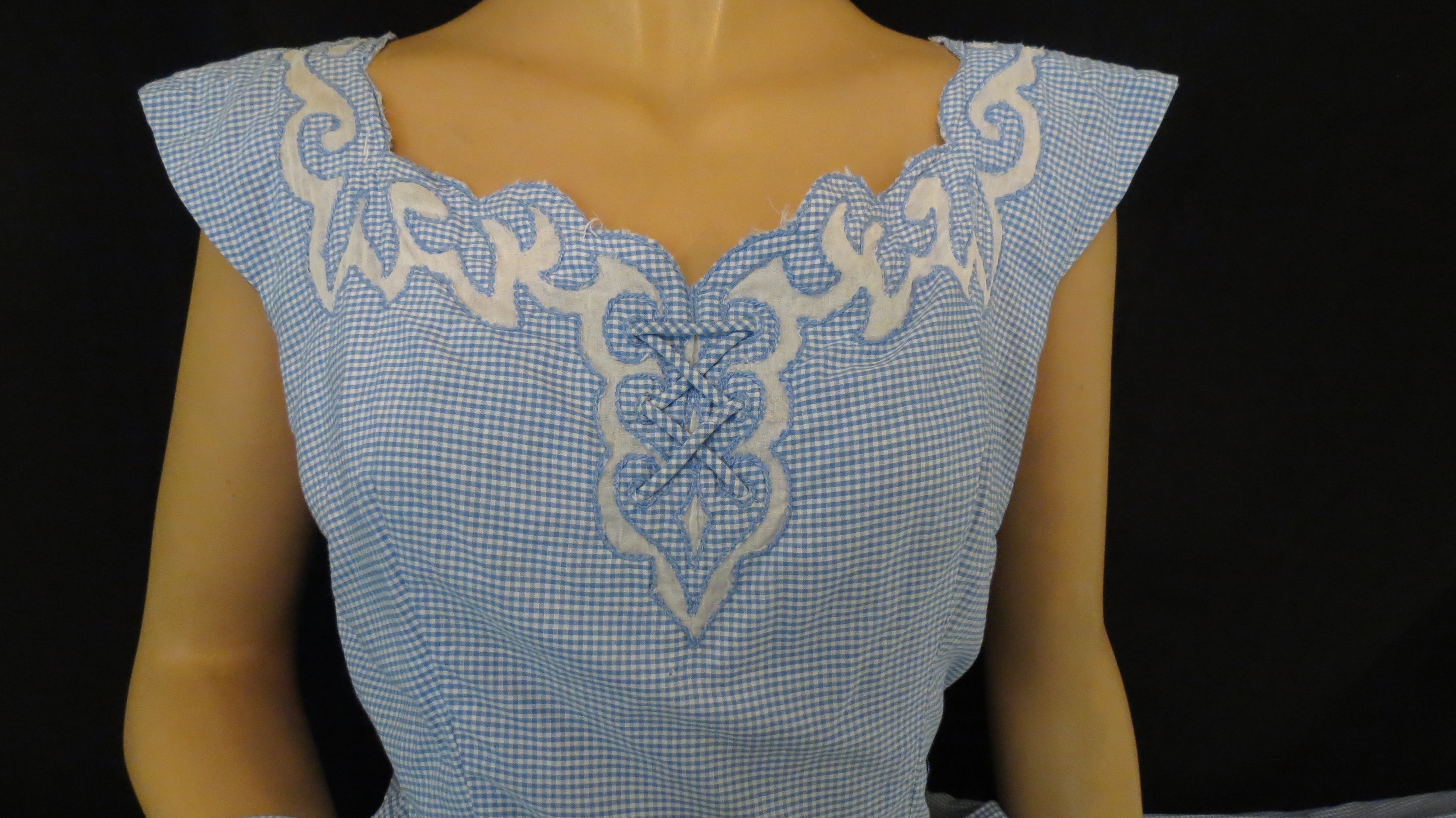 Decorative detailing was still a big deal, whether the dress was a day dress or something more special. Ric rac and embroidery were everywhere. The intricate cut-out design and lacing on the neckline above, though probably done by machine, is a very pretty touch on a flirty frock. Fabric-covered belts were the most common way of cinching a waistline.