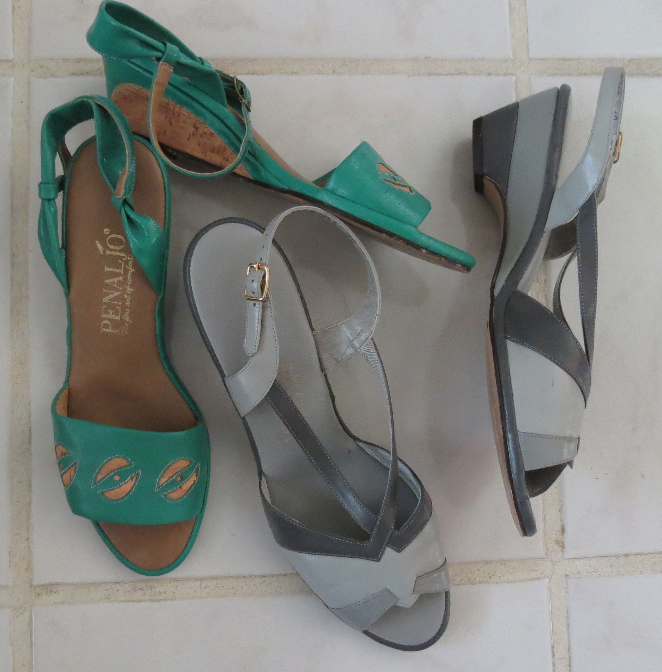 With day-dresses to slacks, I love wedgie sandals and these Eighties does Forties versions did not disappoint me. Their sleek leather sling-back style goes well with almost everything and the 2″ heel gives lift along with walkability. This design carried on into the 1950’s and would look great with the dresses I’ll post tomorrow. Stay tuned . . . . . . . . . . . . . . . . . . .