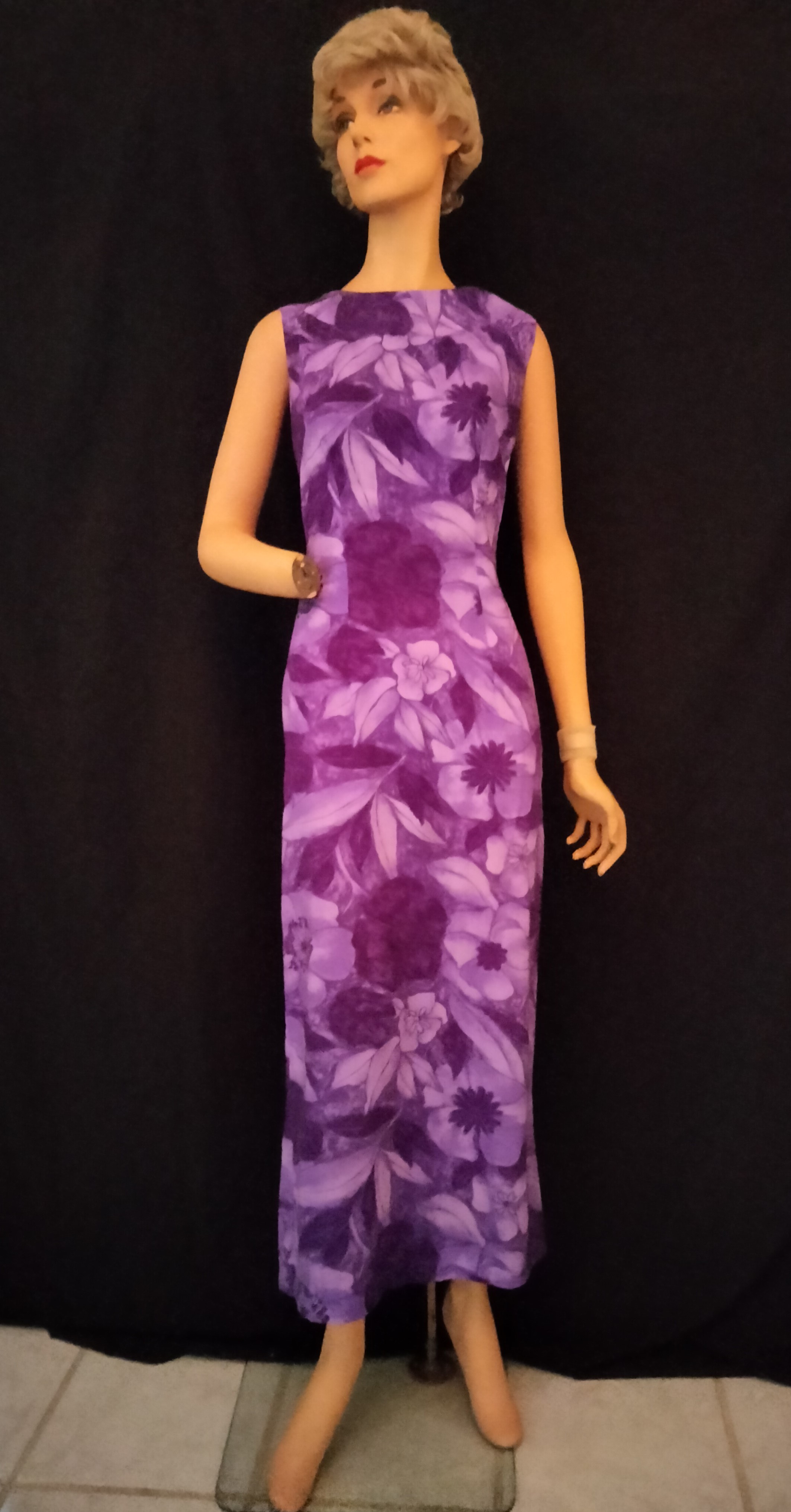 From the 1940’s on, Cheongsam dresses like the lavender one above gained popularity. Mata Hari and Charlie Chan became cultural figures in the media. The beauty and flattering fit of Chinese and Japanese traditional frocks brought interest in Chinatown areas of many cities and non-Asian women began to shop there. Above, see also a Japanese tea dress – fabulous find dating from the 1930’s, made in Hawaii. The purple native traditional gown from Hawaii also found a home in some American woman’s closet after people began traveling again.