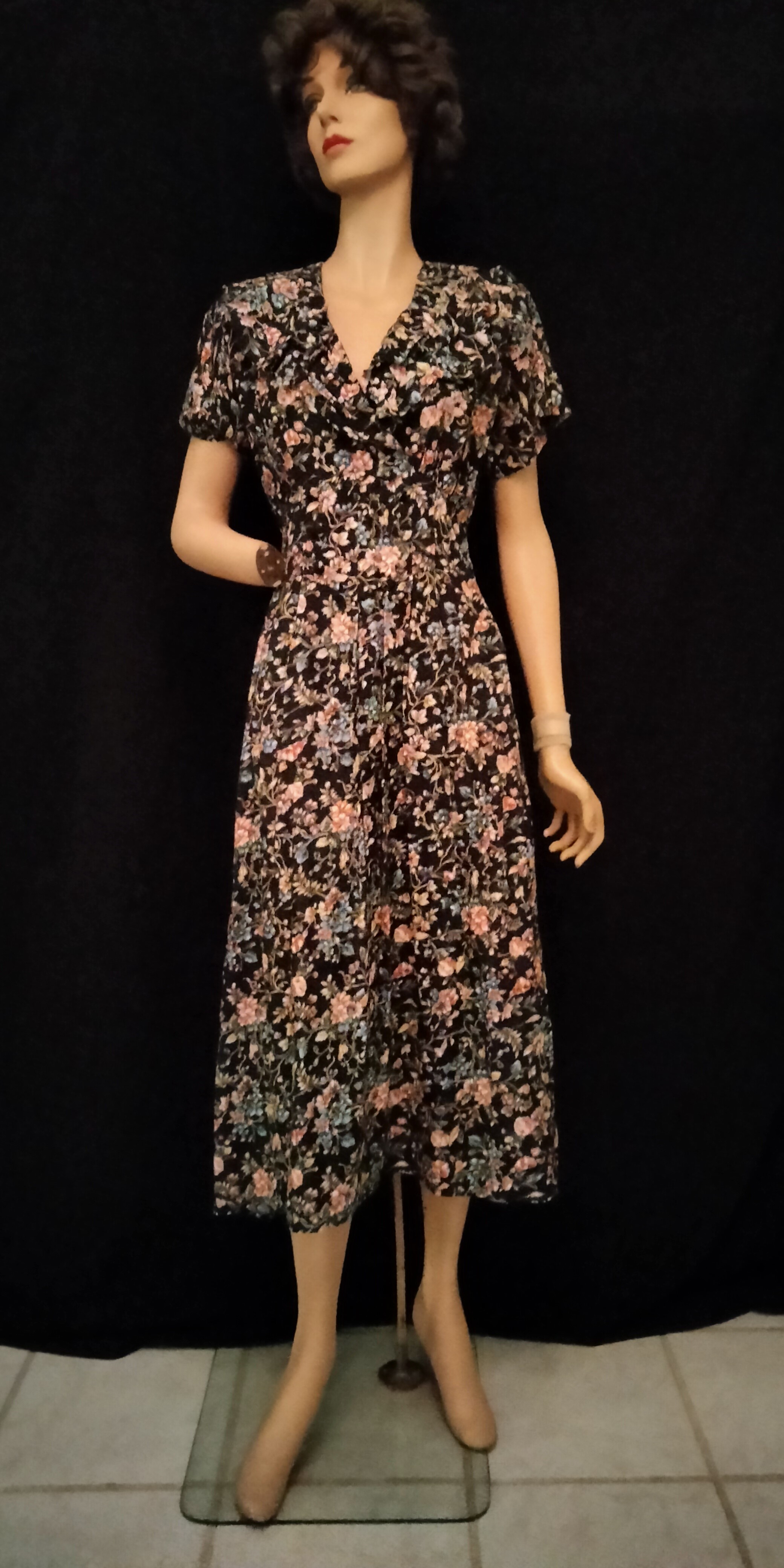 Here’s another group of finds that were fabulous. Let’s look at the details on these frocks, which were over-the-top when wartime rationing was no more and fashion was ready for a break-out right before the New Look. Lots of glitz – rhinestone buttons, metallic thread, sequins, beads, lots of little buttons and velvet. Hemlines went down again. Rayon reigned – it had become the darling of fabrics.