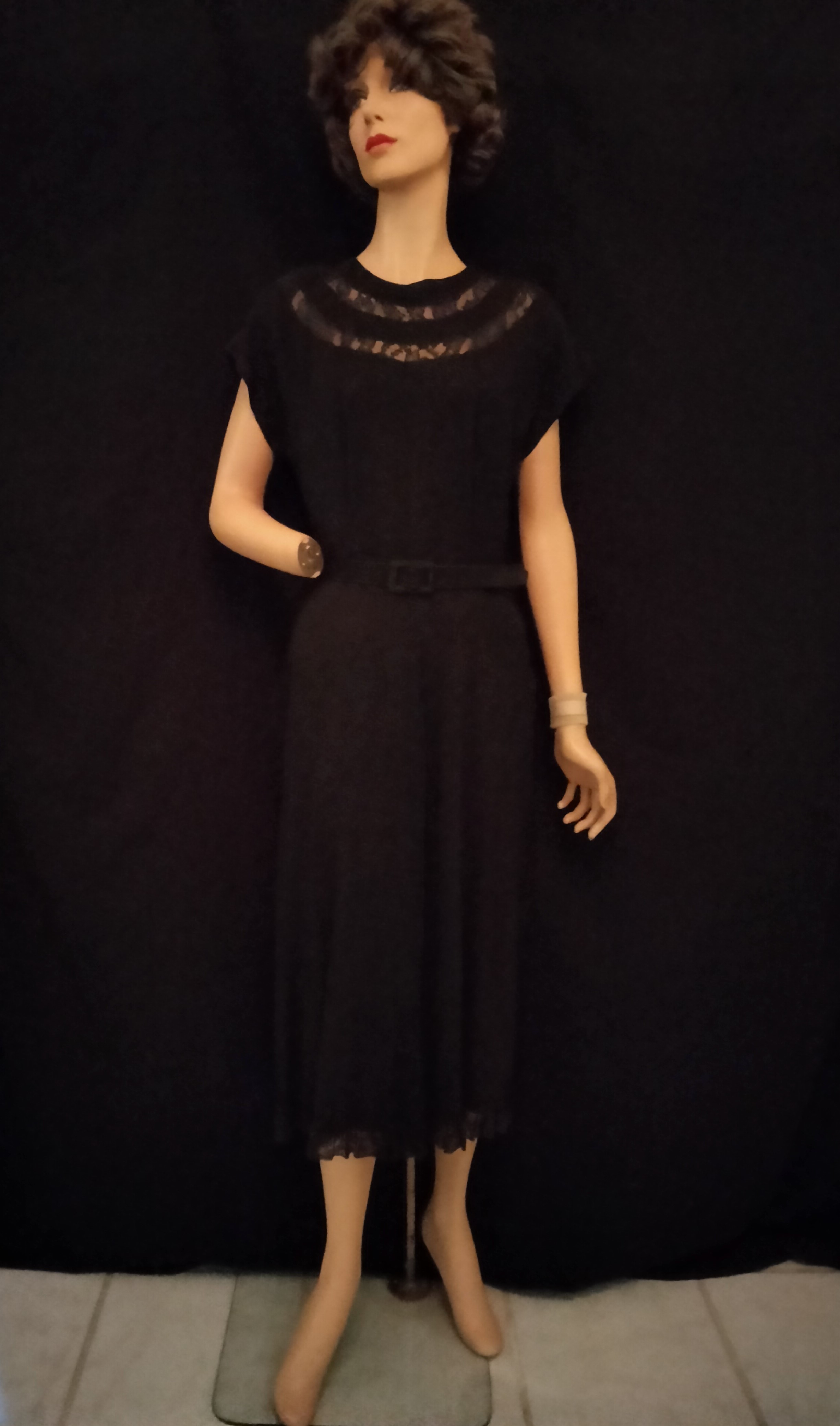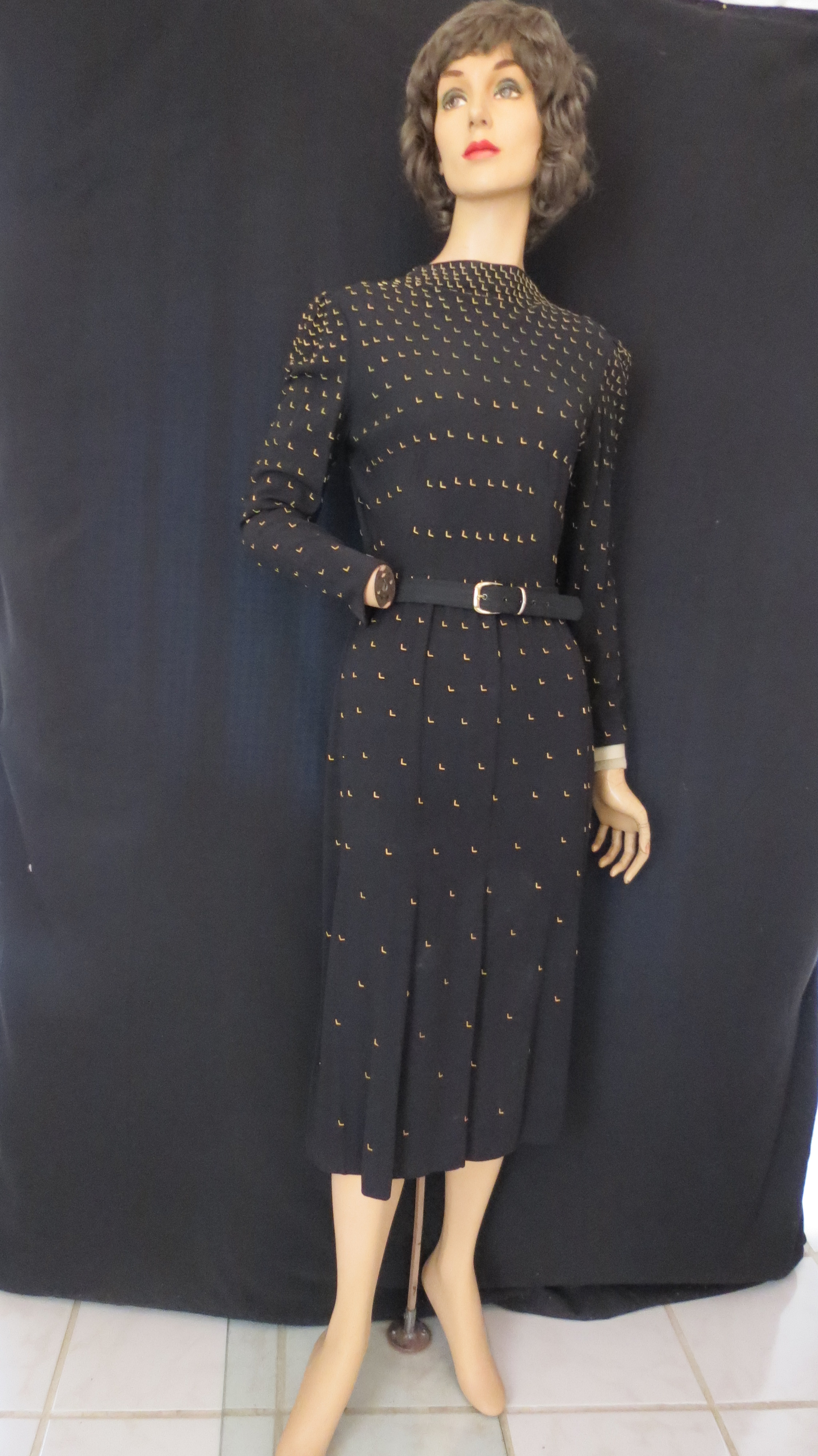 This final black frock is probably meant for cocktails, dinner or evening, though very tailored. It comes from the early Forties or perhaps the Thirties, with it’s Deco-style decoration with metal studs.