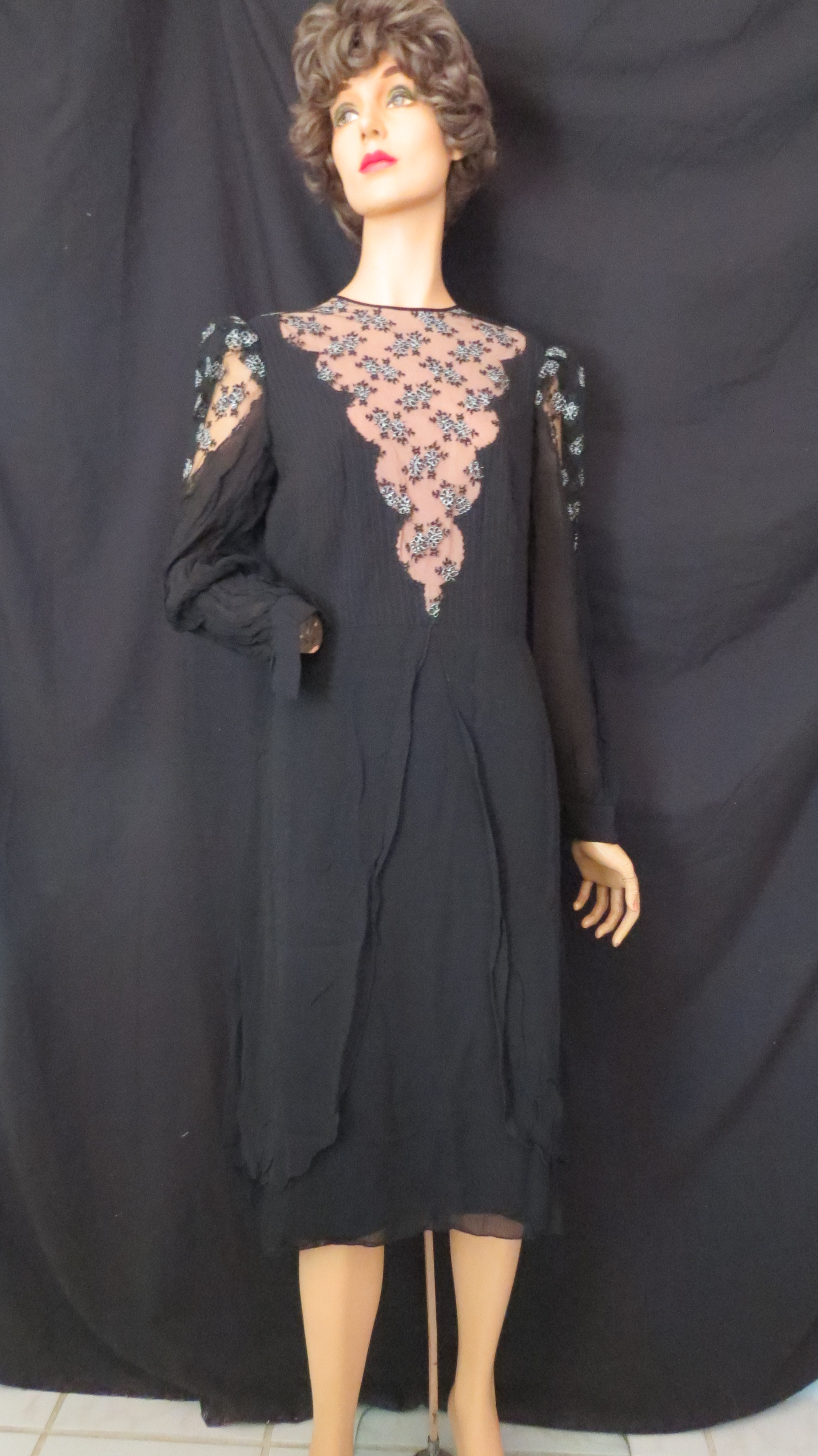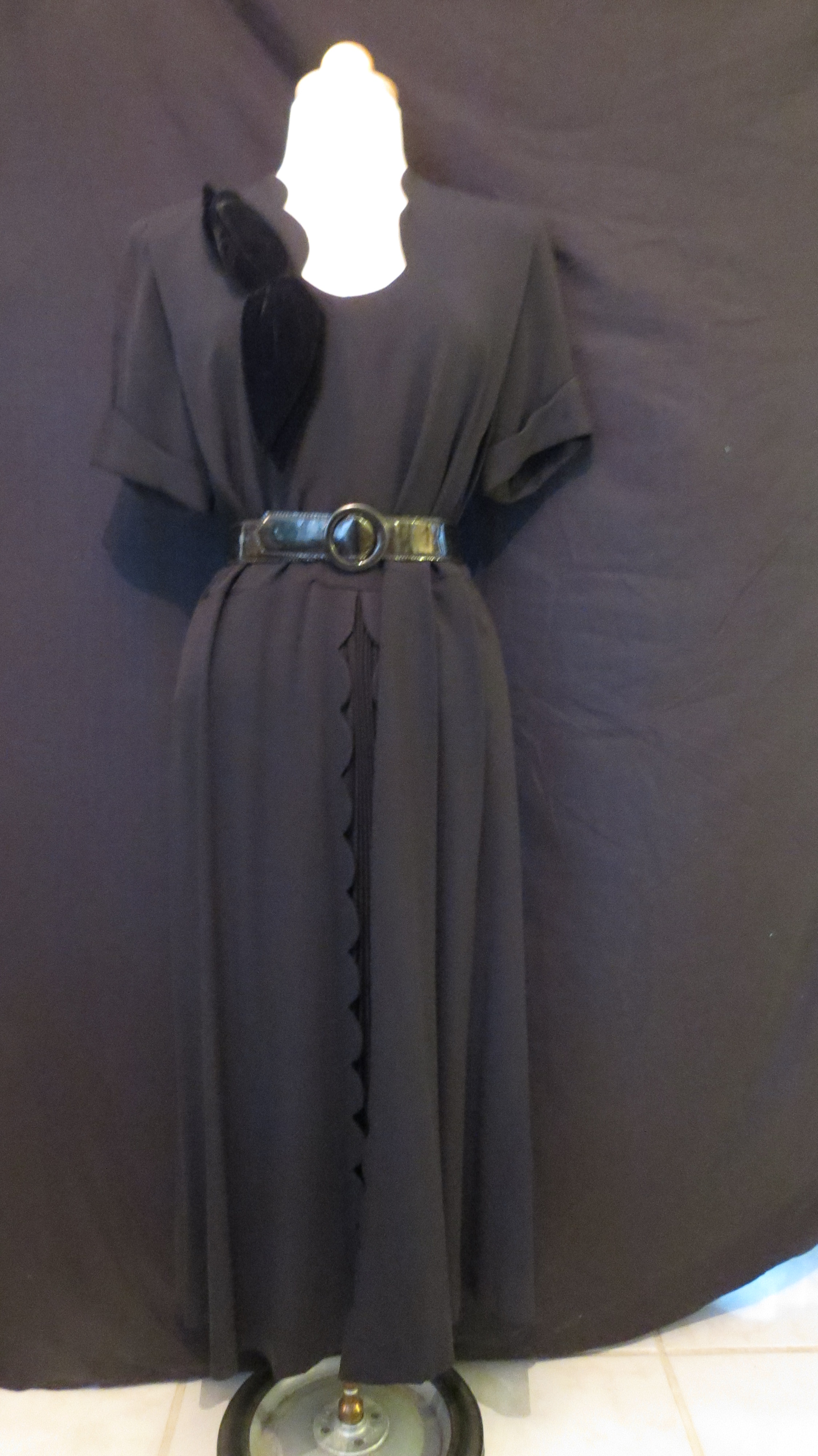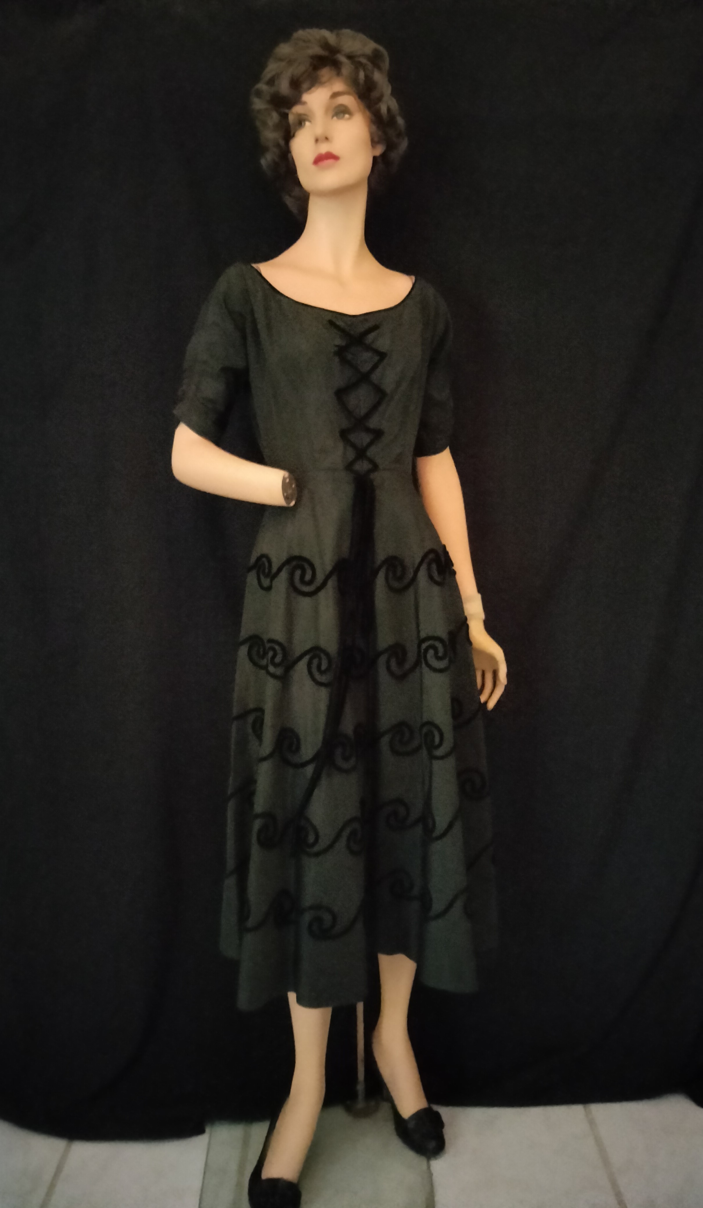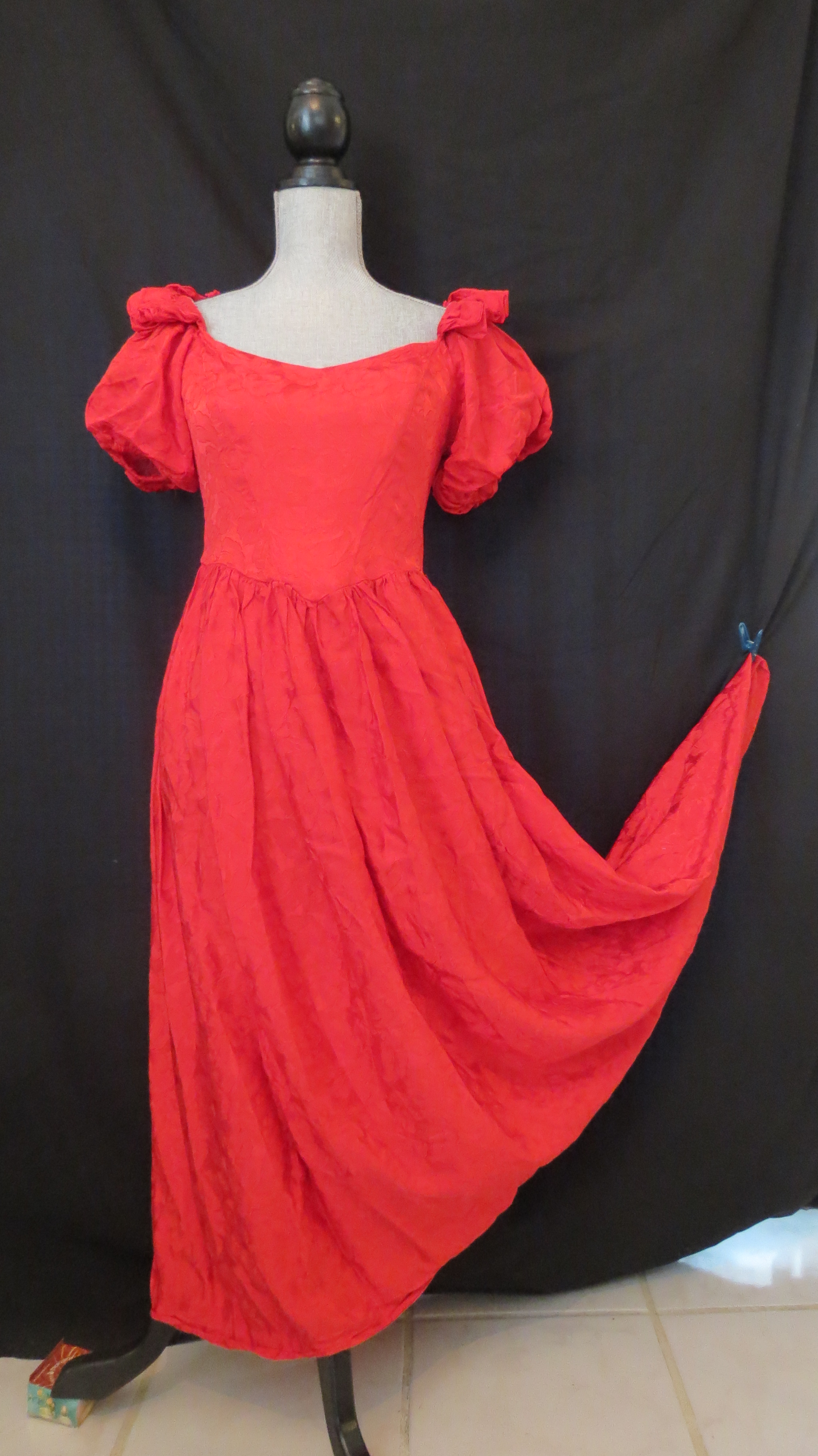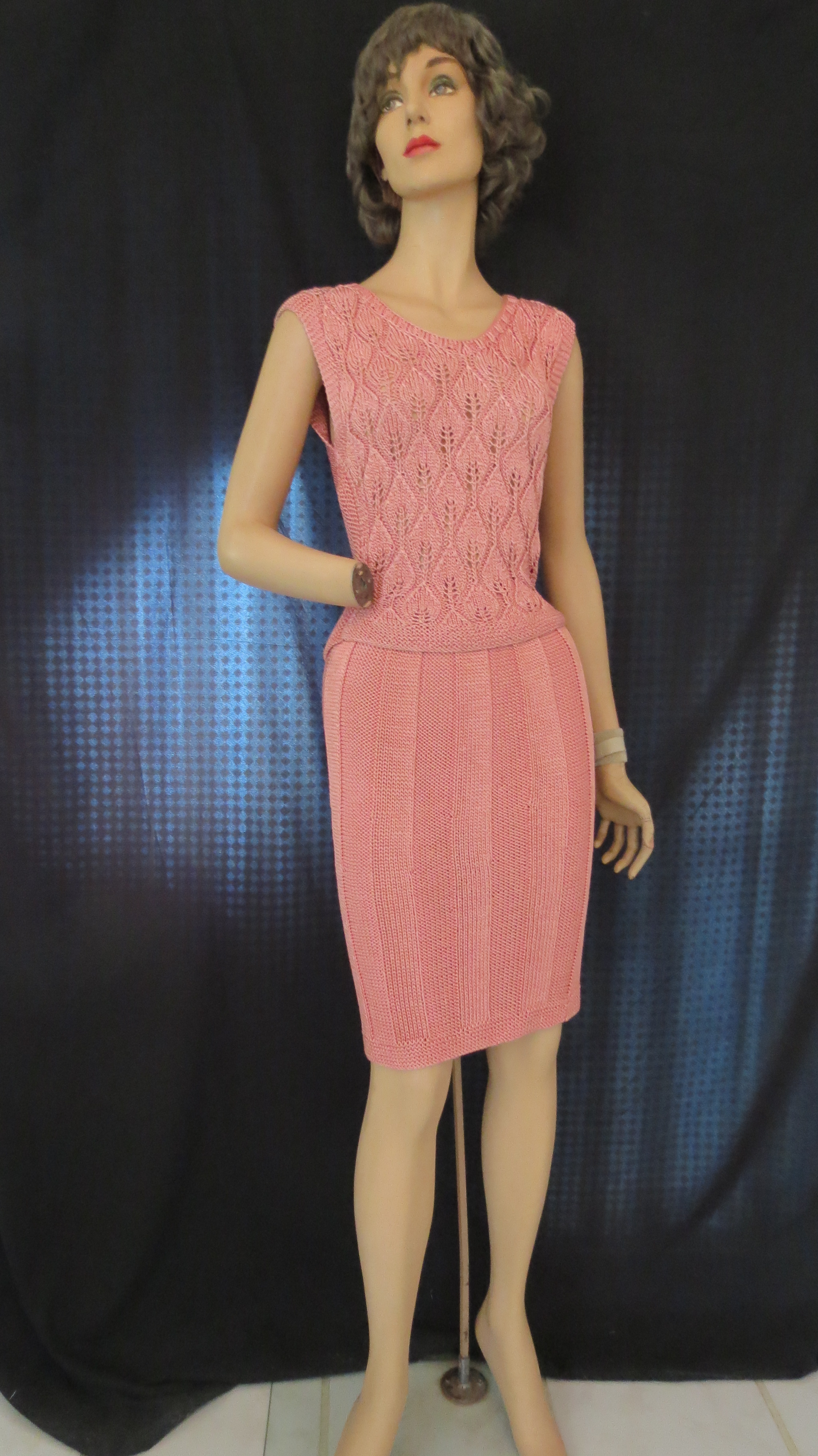 Synthetic fabrics were most available and affordable, so this red jacquard frock with puffed sleeves and an elasticized neckline which allowed cold shoulders was home-sewn. A similar style in black was local couture from a specialty shop in Texas and has ruched 3/4 sleeves and shows off the luxury of velvet piping decoration. The pink knitted and crocheted 2-piece cocktail dress was another unusual find which somehow found it’s way to Argentina. It’s made of a heavy, glossy/shiny yarn that allowed some gal to make a glamorous outfit on the cheap.