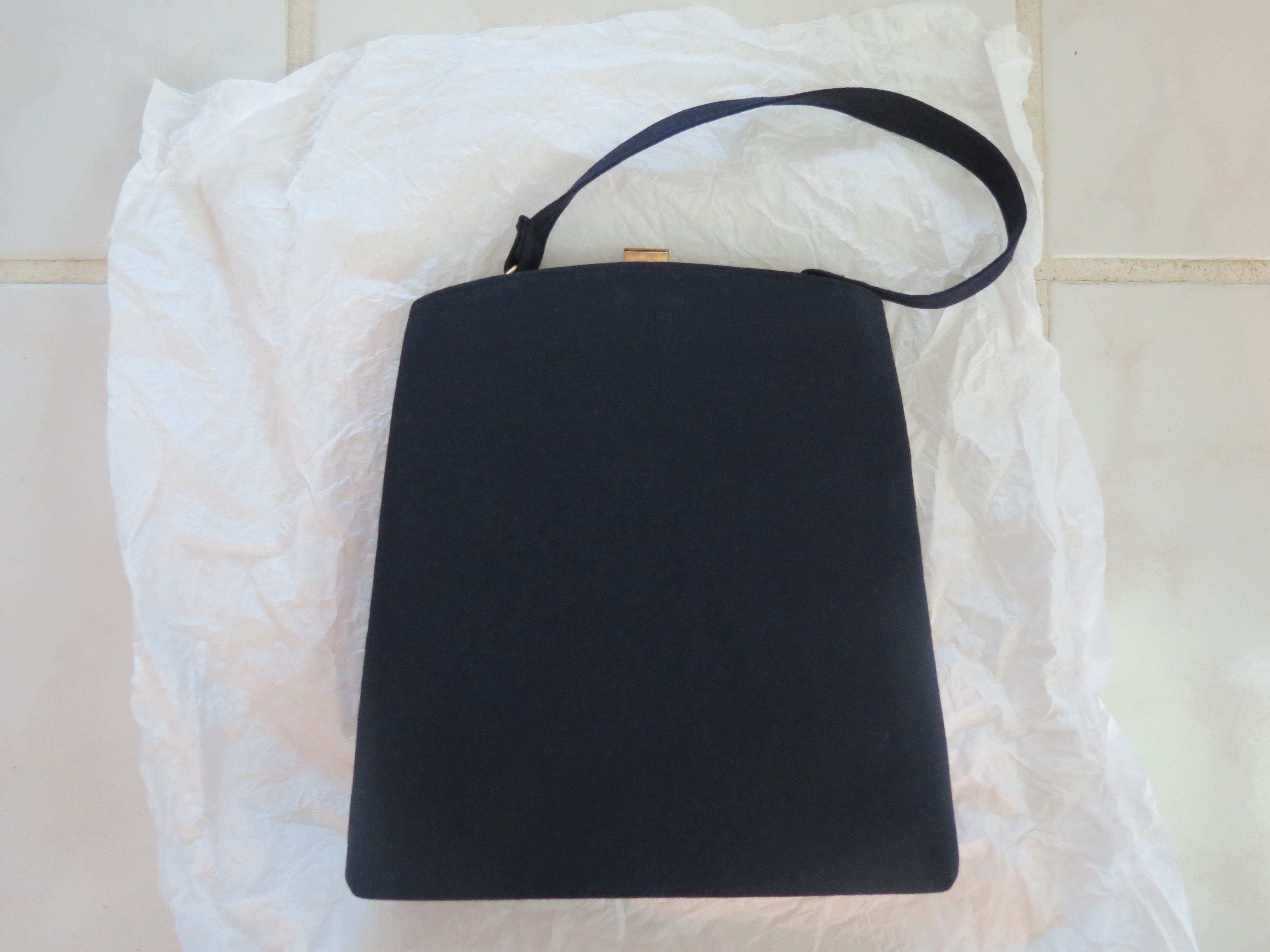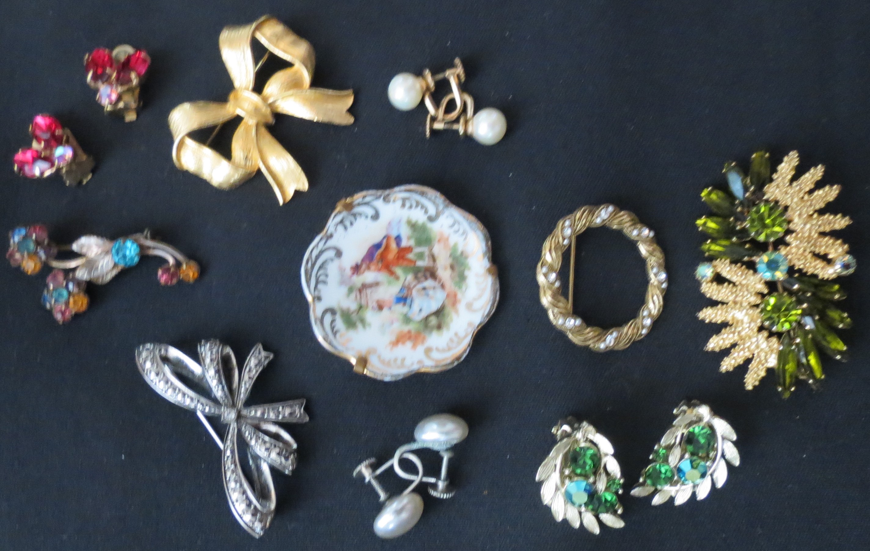 Mid-century costume jewelry pins and brooches like the ones in this picture, especially those on the left side, might have been worn with dresses like this and a dark navy handbag like the one above is a nicer 1940’s style with a fabric body and strap.