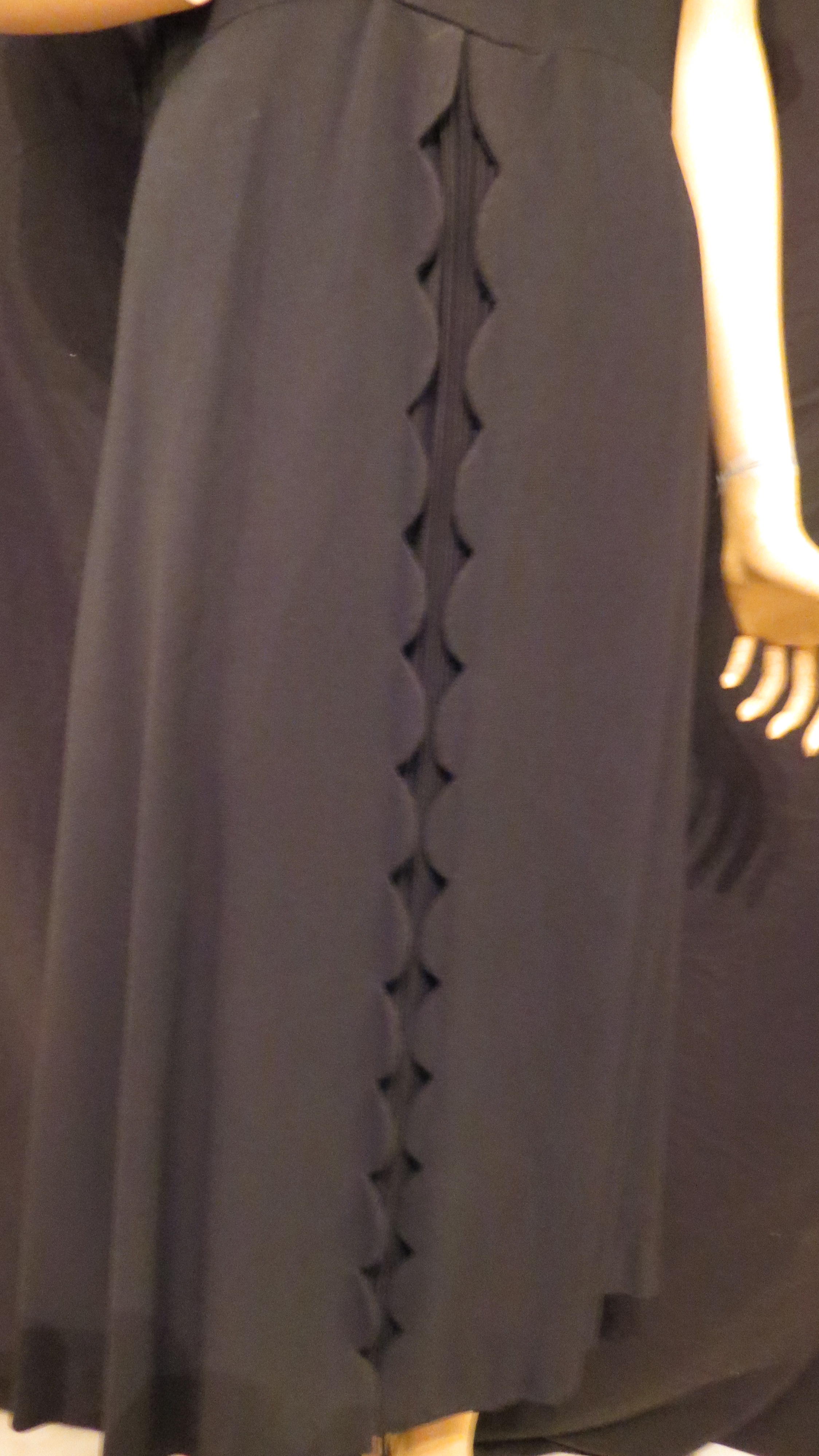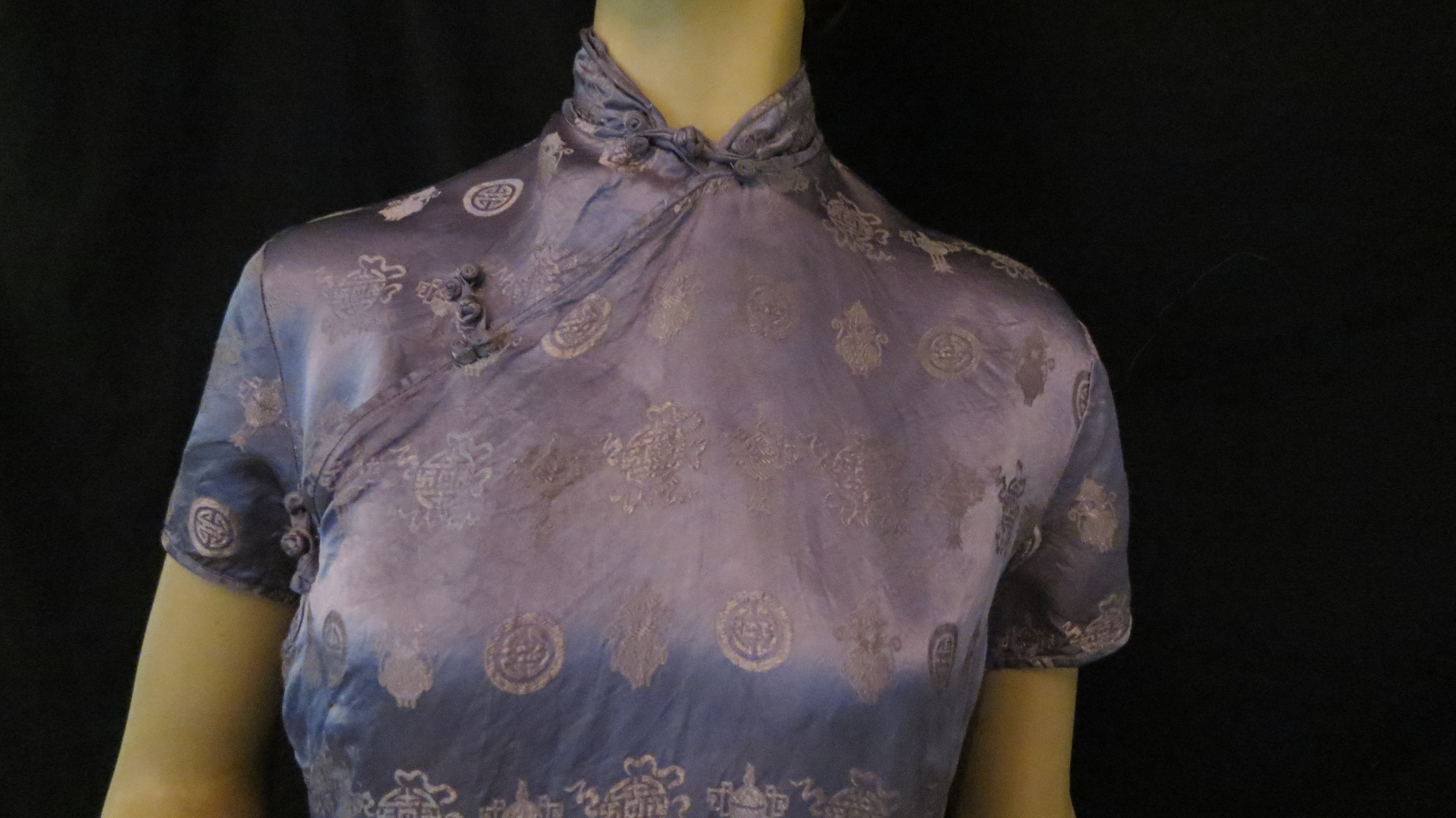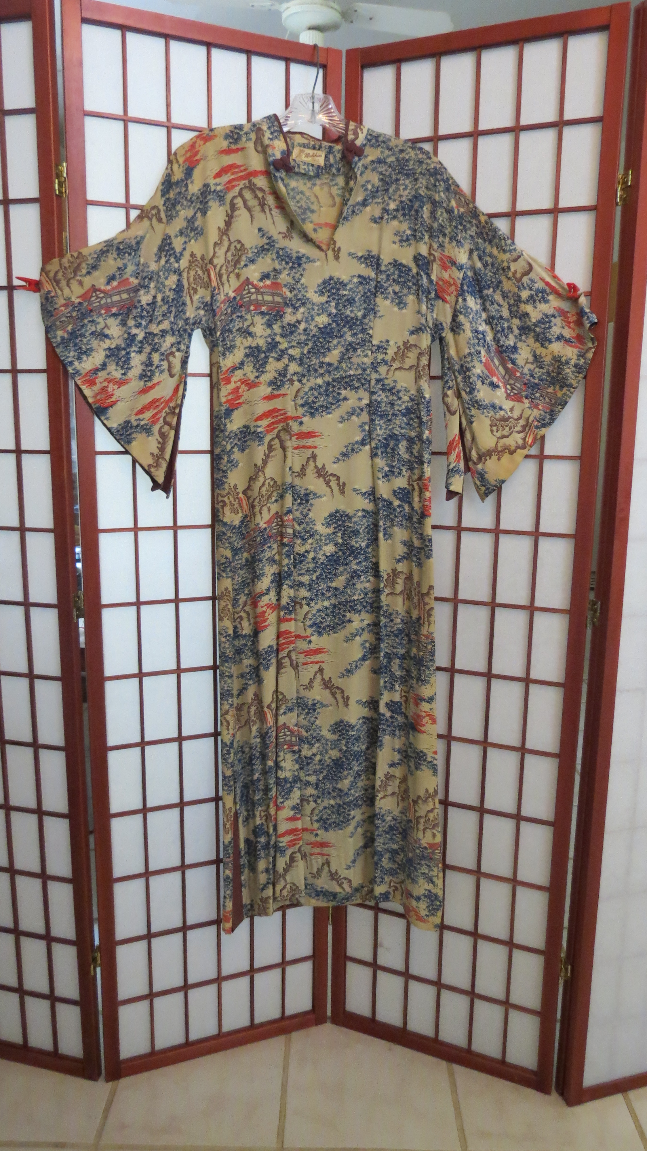 Before 9-11 it was hard for young U.S. Americans to understand the shock and fear that the attack on Pearl Harbor caused in December 1941. The government’s decision to join WWII, which had been happening in Europe and seemed remote to most everyday folks in the U.S., suddenly brought it close to home. The news and the movies began to open the doors on Asian culture and the curiosity of Americans and popular culture started to make this theme trendy. These dresses are from some of my most interesting investigations.