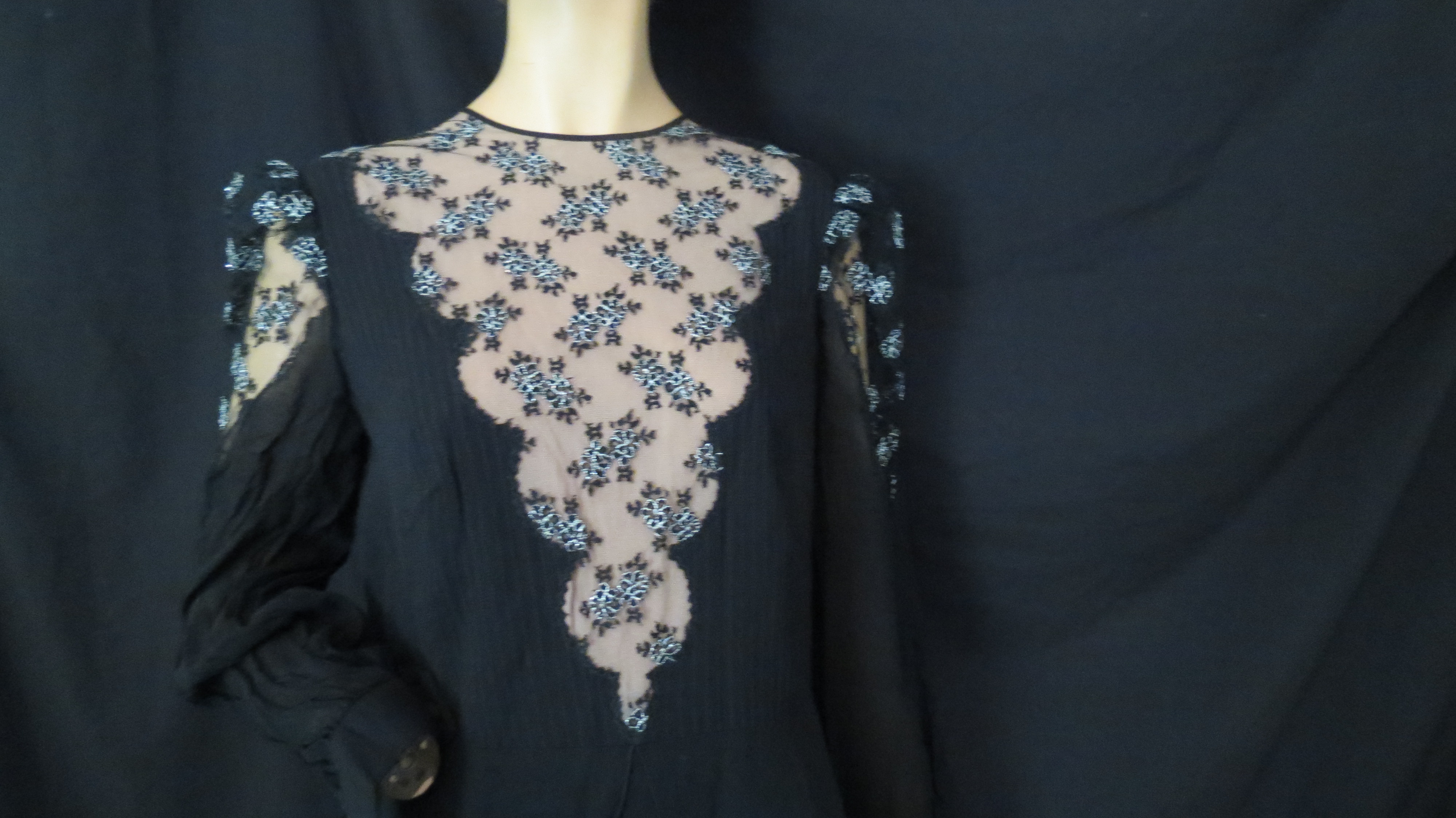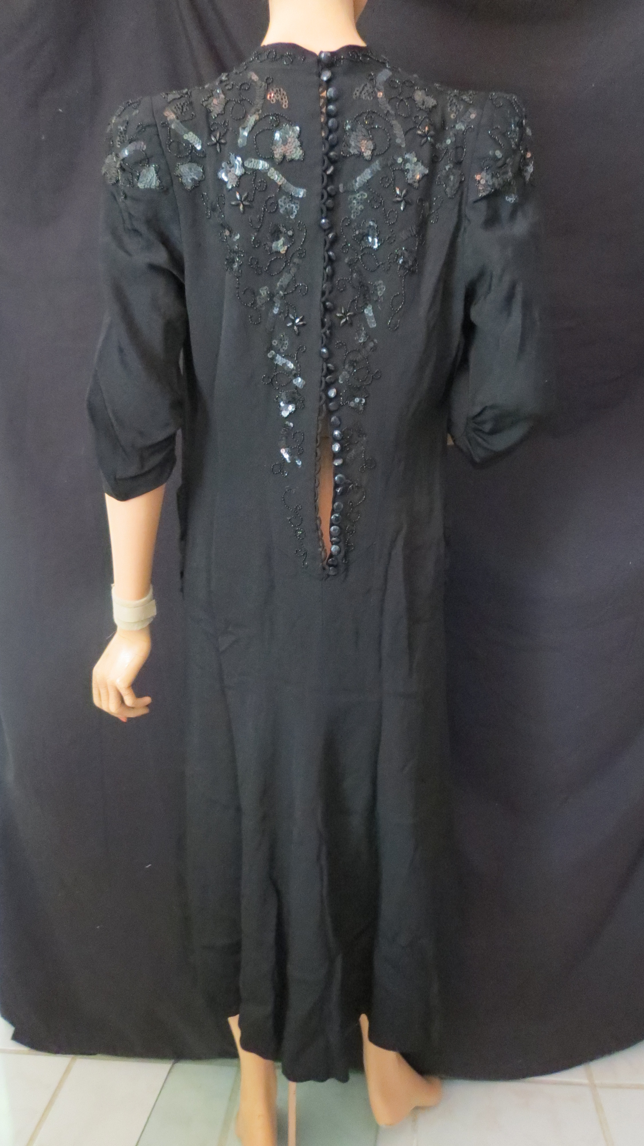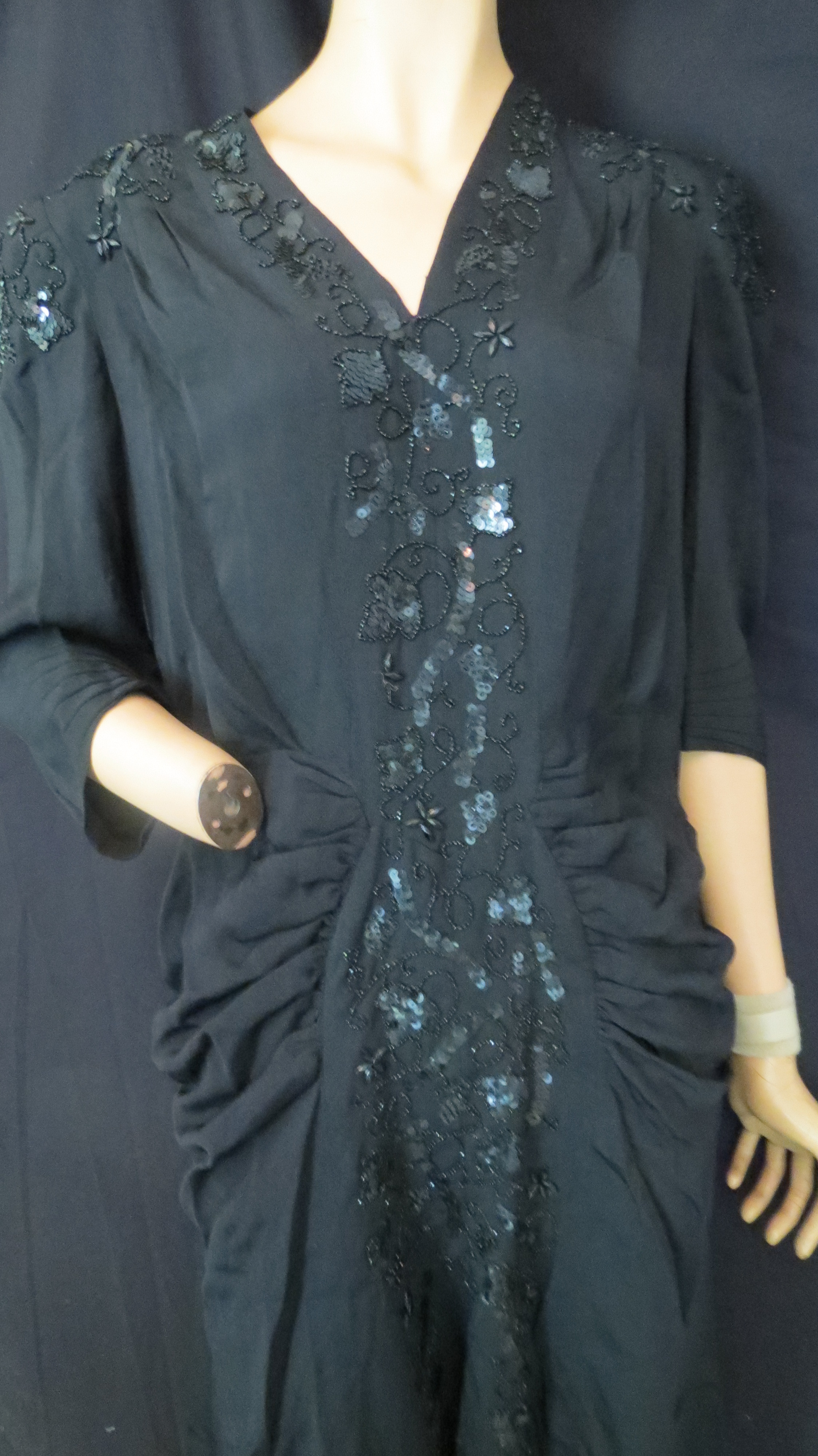 Before 9-11 it was hard for young U.S. Americans to understand the shock and fear that the attack on Pearl Harbor caused in December 1941. The government’s decision to join WWII, which had been happening in Europe and seemed remote to most everyday folks in the U.S., suddenly brought it close to home. The news and the movies began to open the doors on Asian culture and the curiosity of Americans and popular culture started to make this theme trendy. These dresses are from some of my most interesting investigations.