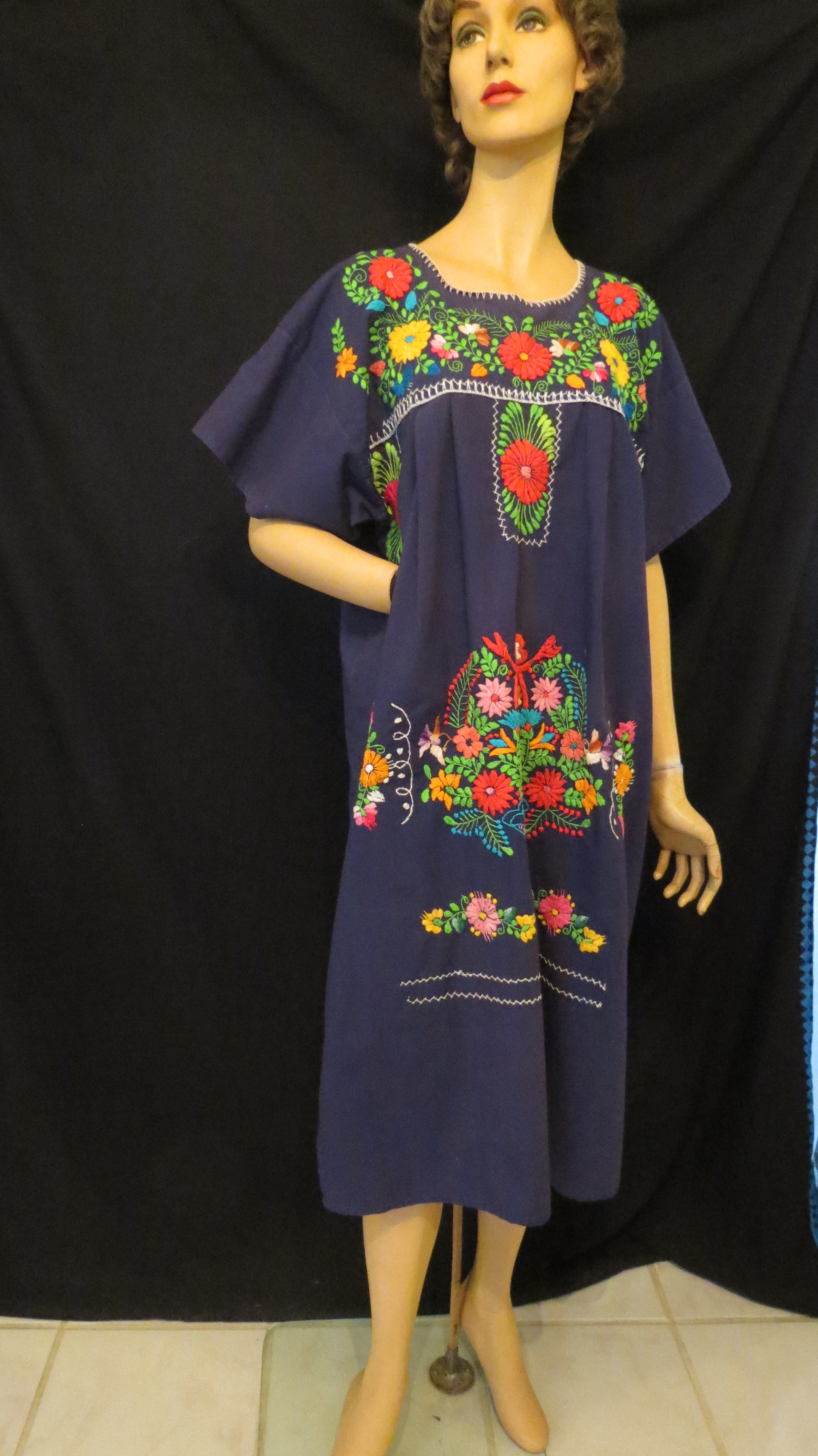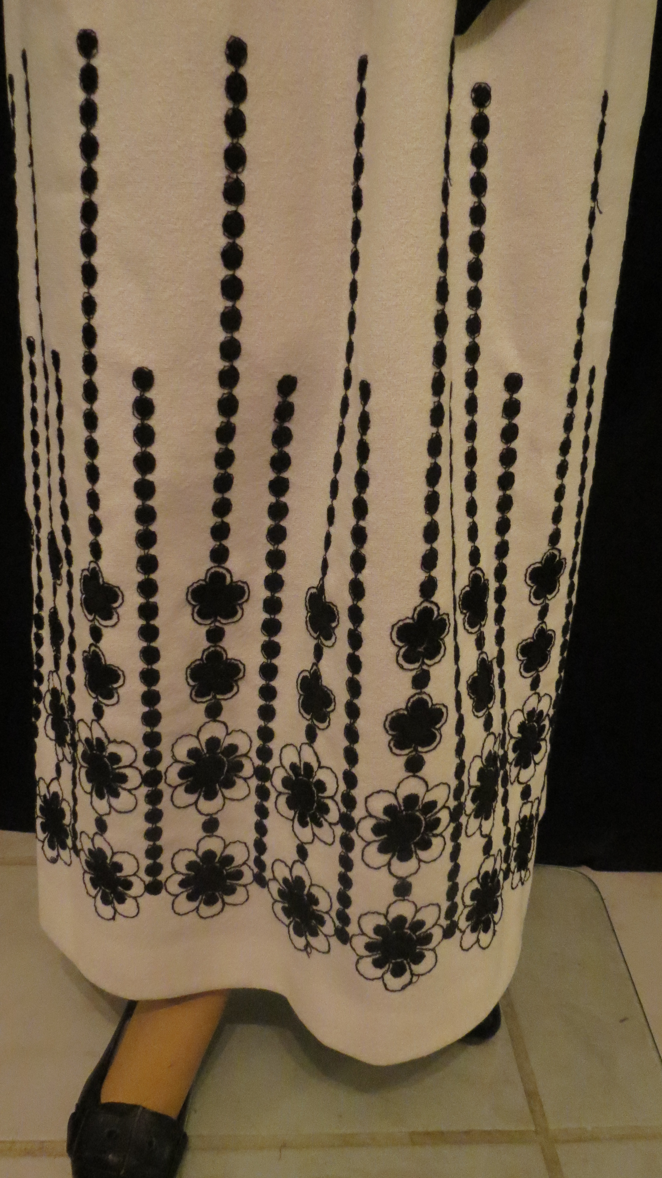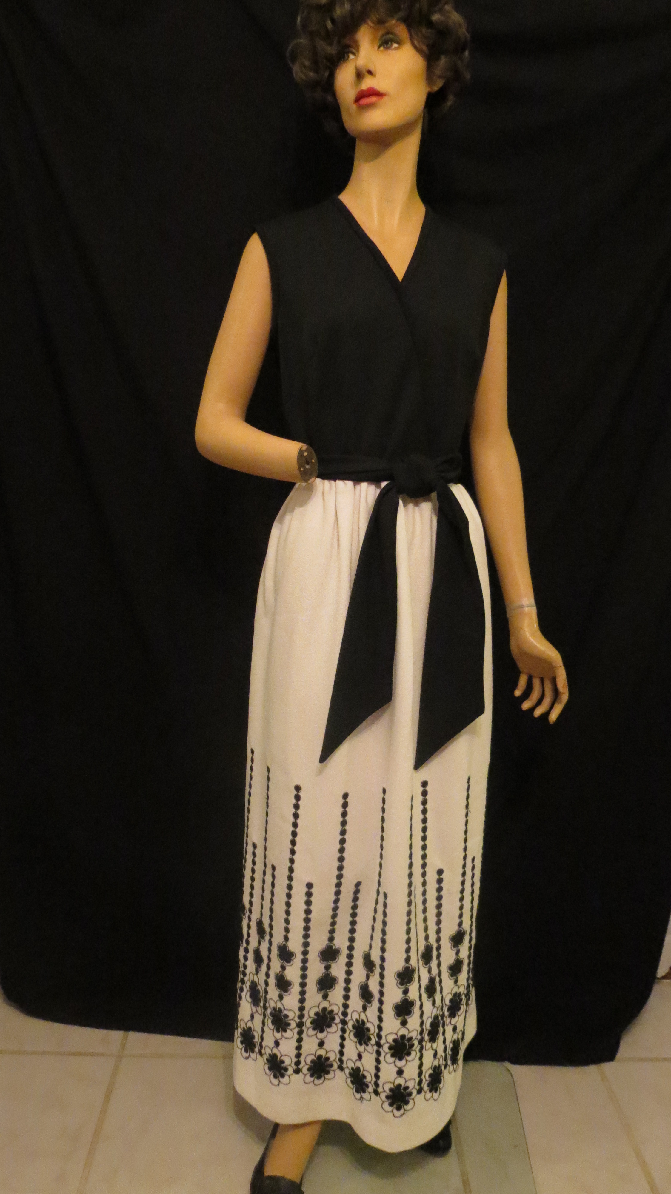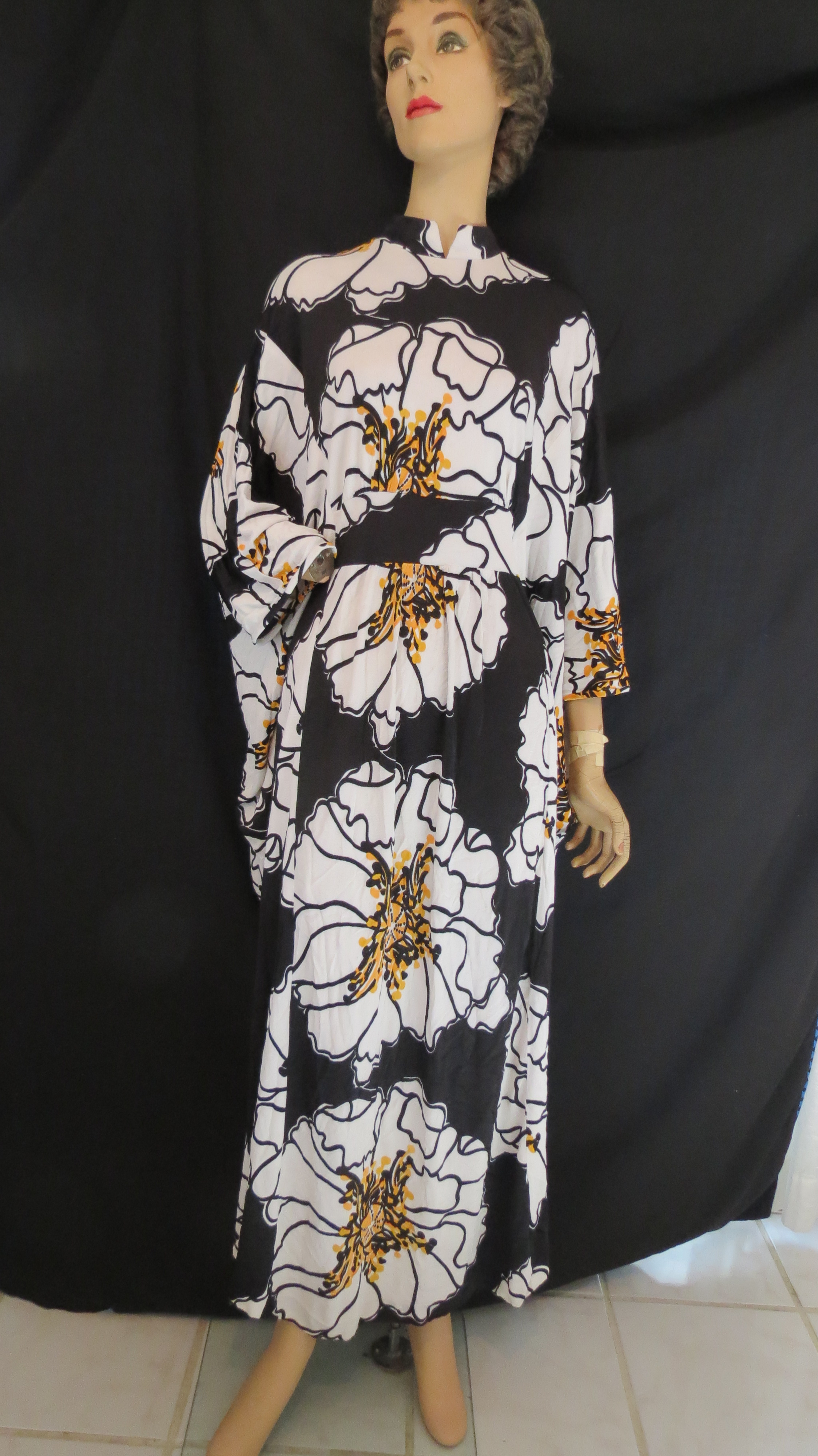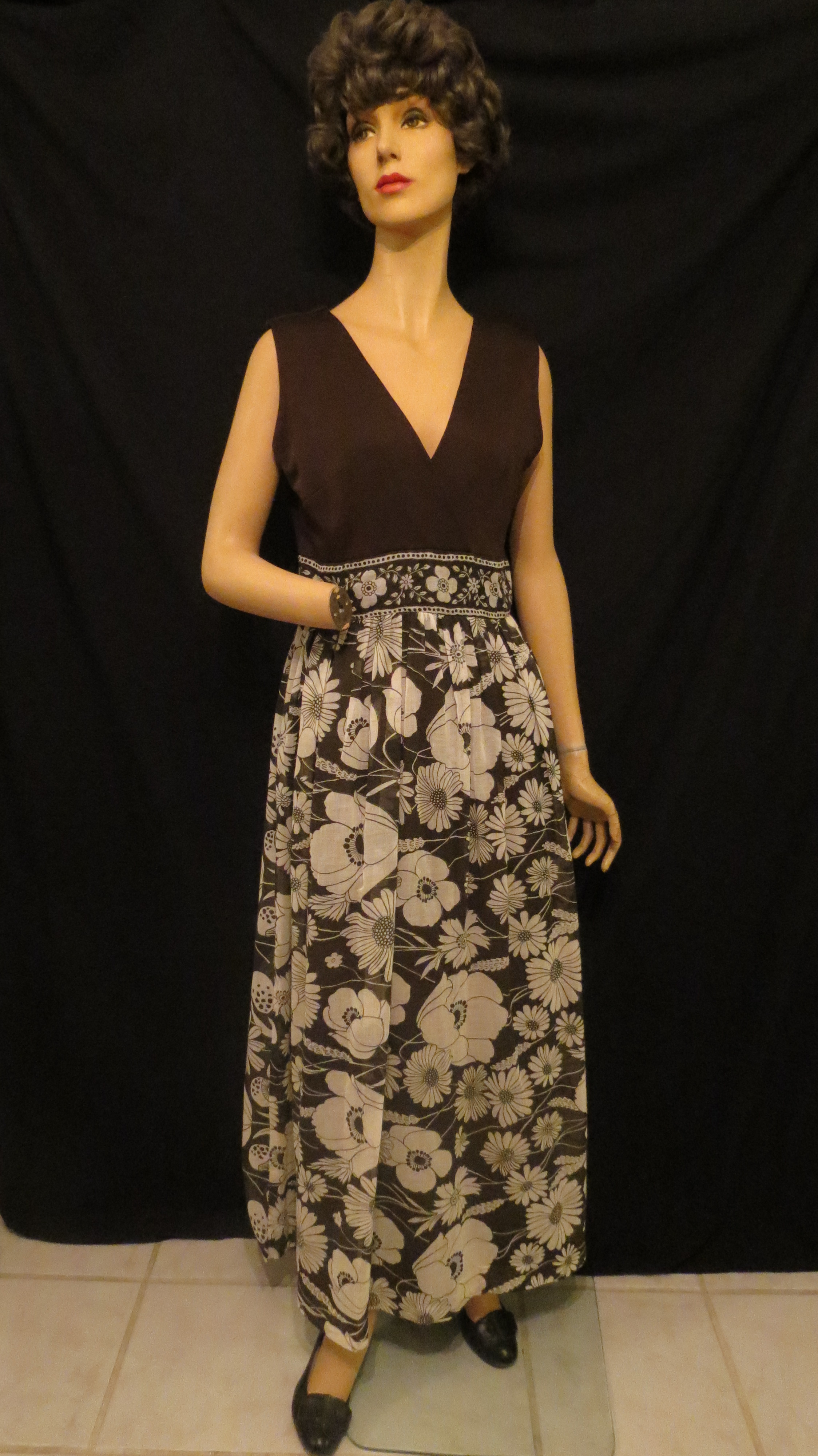A black and white floral print gown made in Hawaii. This one is from the 1980’s, give or take a decade and is the most elegant. Same deal about the fabric as in the previous dress. The style is pure average conservative, which makes it harder to date exactly. A pretty dress, but nothing distinctive about it excepting for excellent tailoring. It might have been a wardrobe item of someone who lived in Hawaii, purchased at a specialty shop stateside which carried Hawaiian garments or by someone who bought it while on vacation. Hawaiian-made gowns have been popular with women worldwide since the 1950’s, but earlier ones were usually made in more traditional Hawaiian style and, often, of Hawaiian fabric with traditional island prints. The more mainstream universal designs like this one came later.