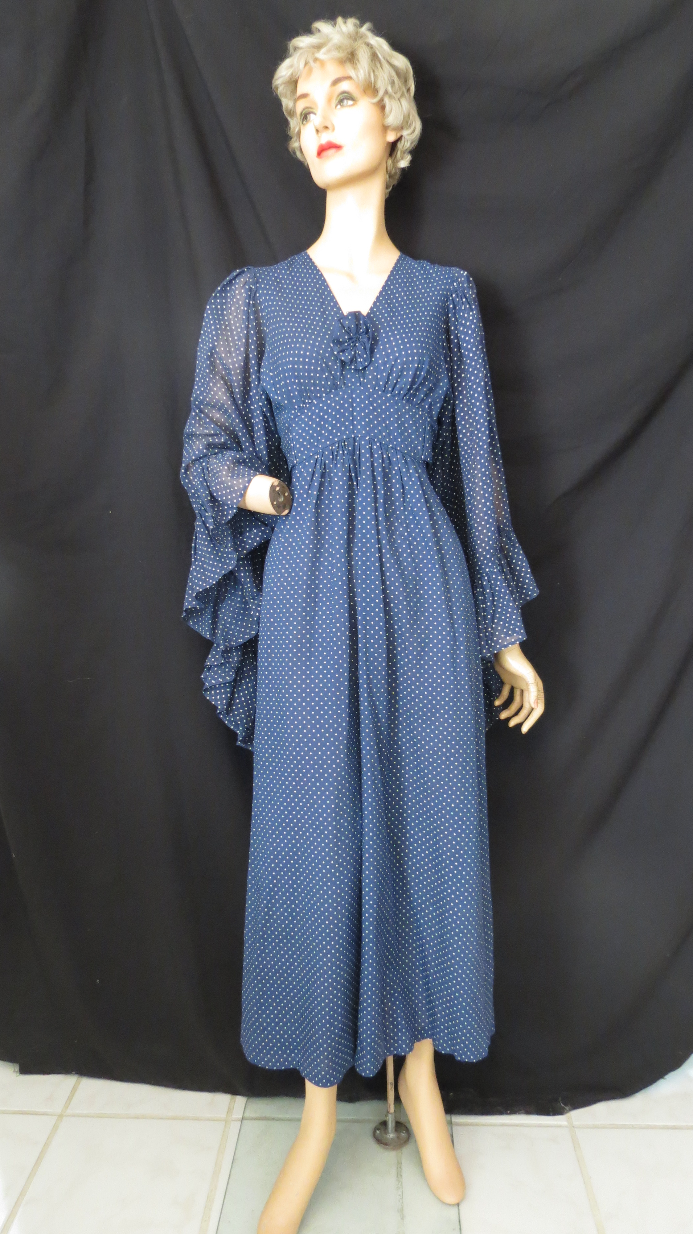 A Prairie-style gown, pretty and modest in cotton. Looks like it was made for retail because of the precise tailoring detail, but there is no label. I would put it in the 1970’s but it could possibly have been made later by an individual expert or a company that catered to a niche market which preferred very modest styles of dress.