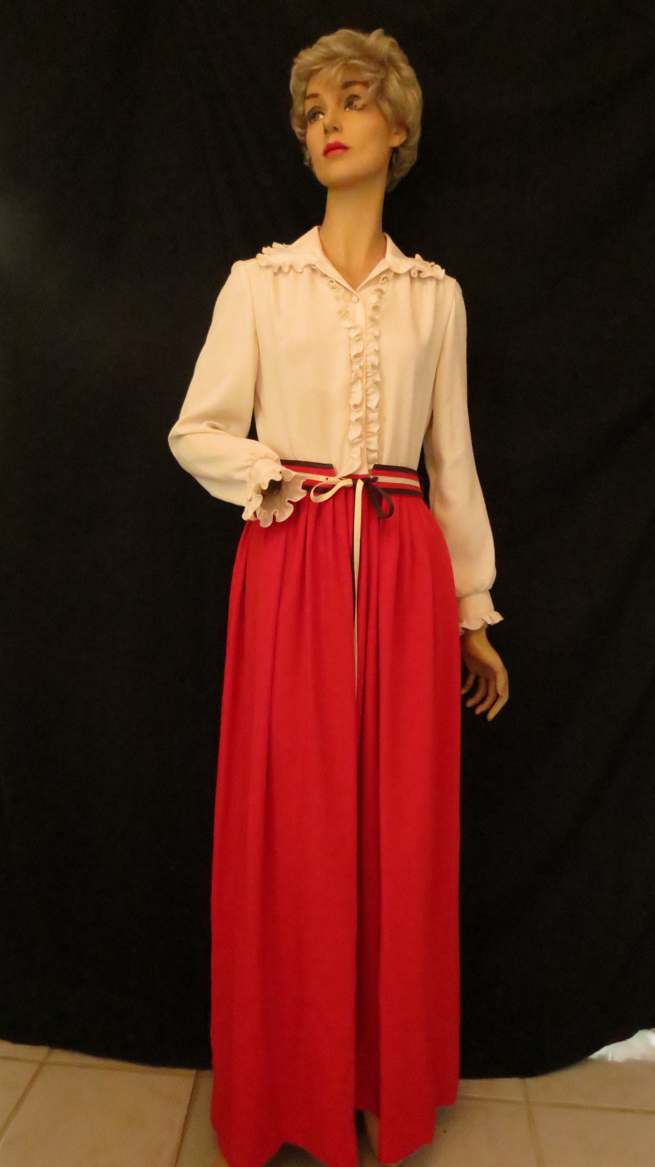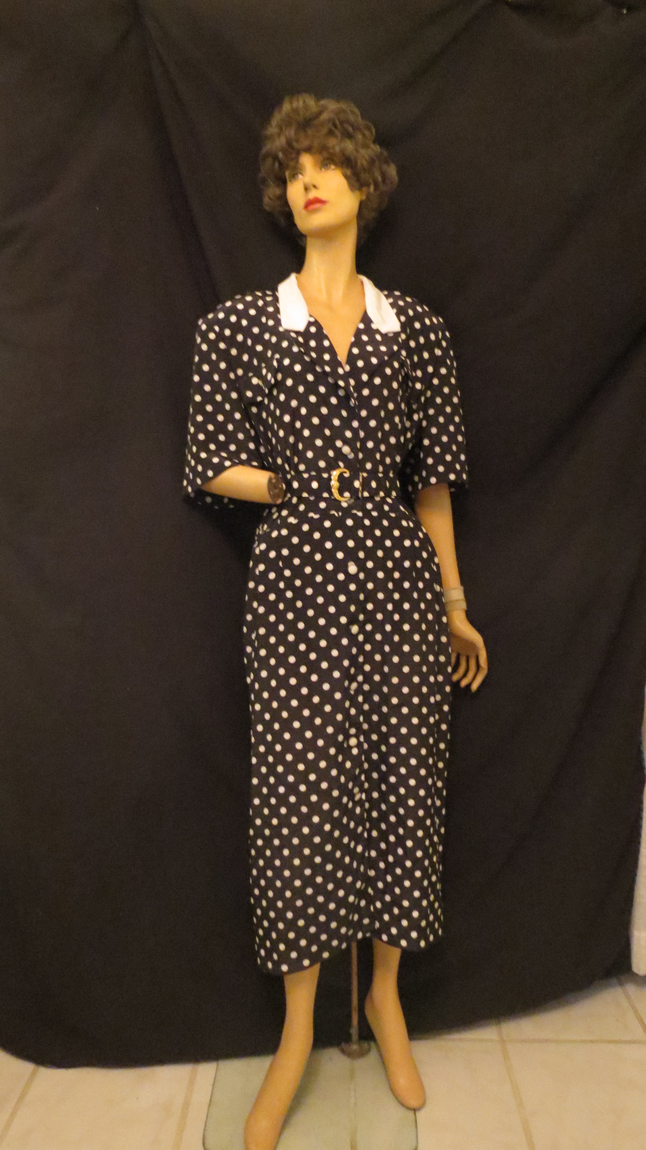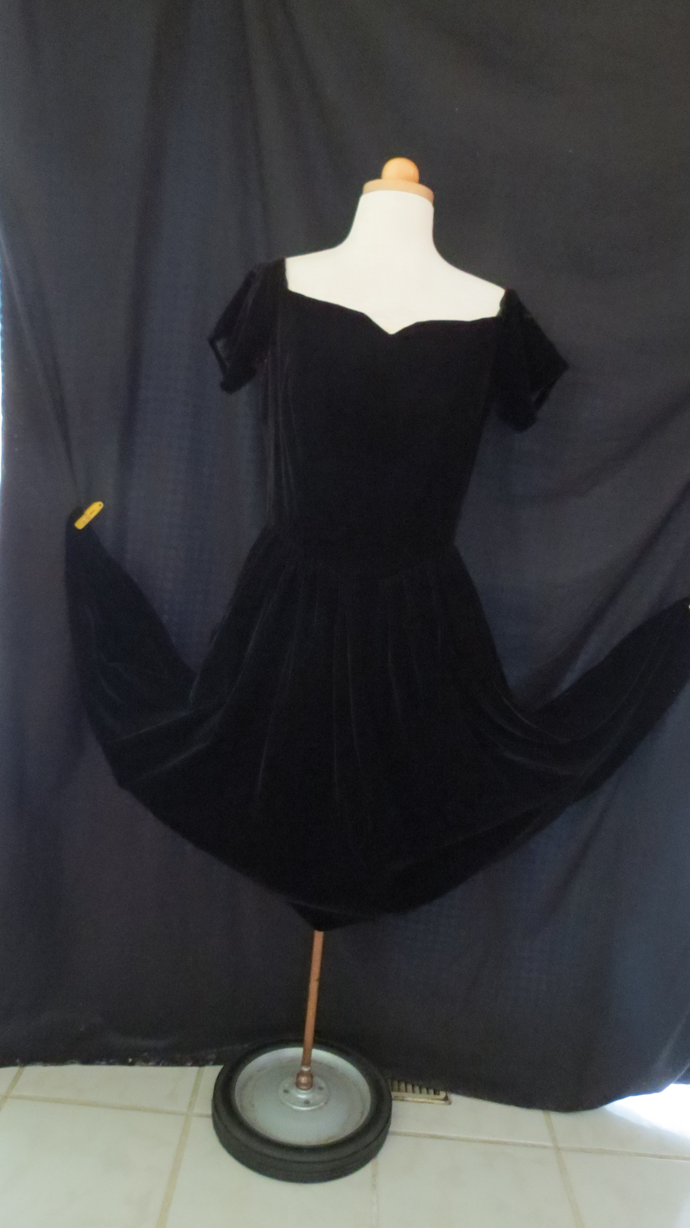 The top two designs are squarely U.S. American and the tag on the dress with the big velvet bow indicates that it was made by a company that was producing affordable garments, probably during the early recovery from wartime. The navy blue dress was higher-end and looks so much like the costumes seen in late 1940’s film noir.
