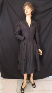 Here’s a great find from the ’70’s – a black taffeta dress by Jessica McLintock from her Gunne Sax label. It’s got netting, beading and button & loop detail around the neck and bodice in “old West” style.