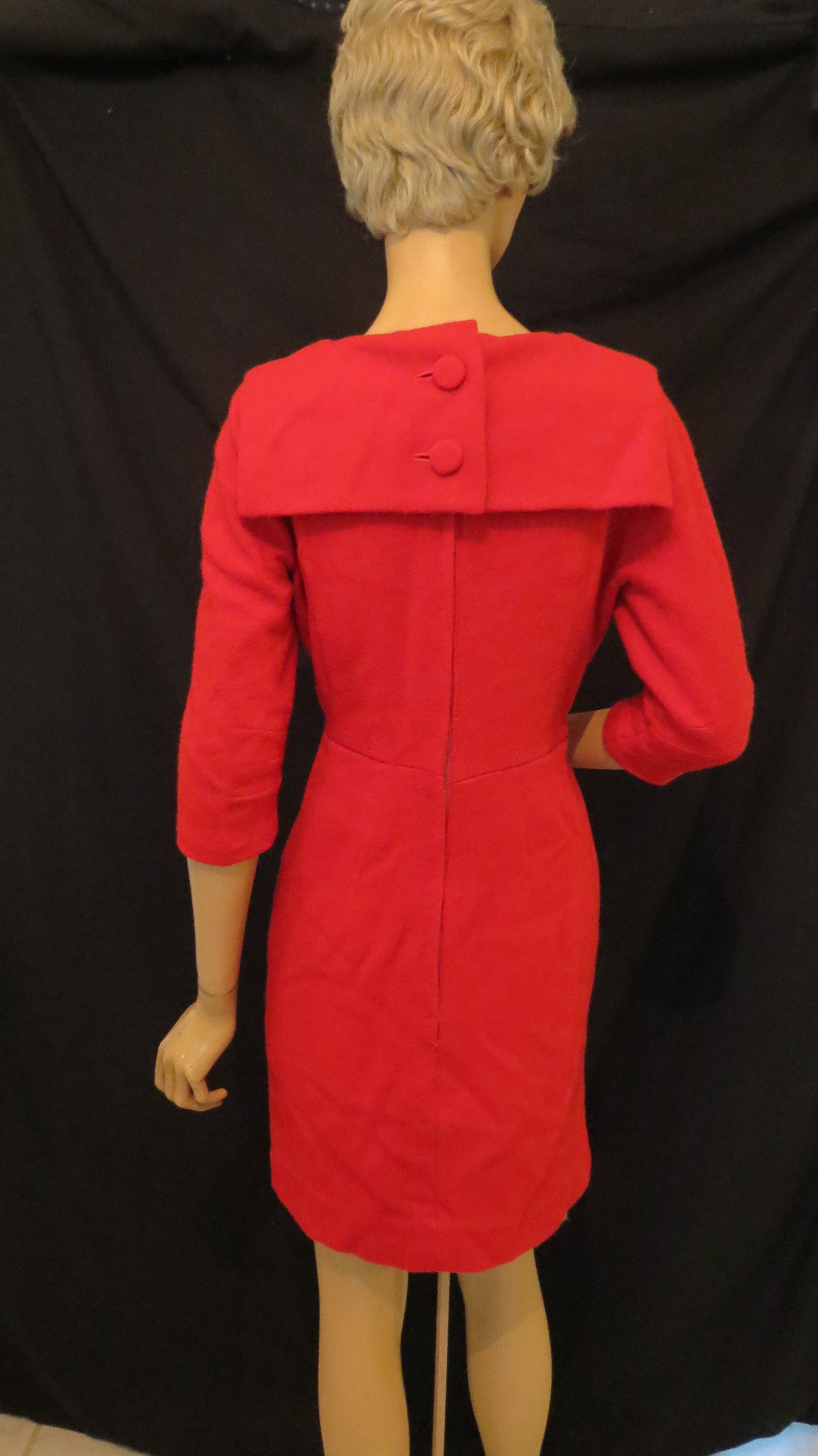 There’s no label – I suspect the dress was custom-tailored. And, for a woman a lot shorter than Stella – the hem should at least be at the knee and the sleeves a tiny bit longer because I’d date it about 1960.