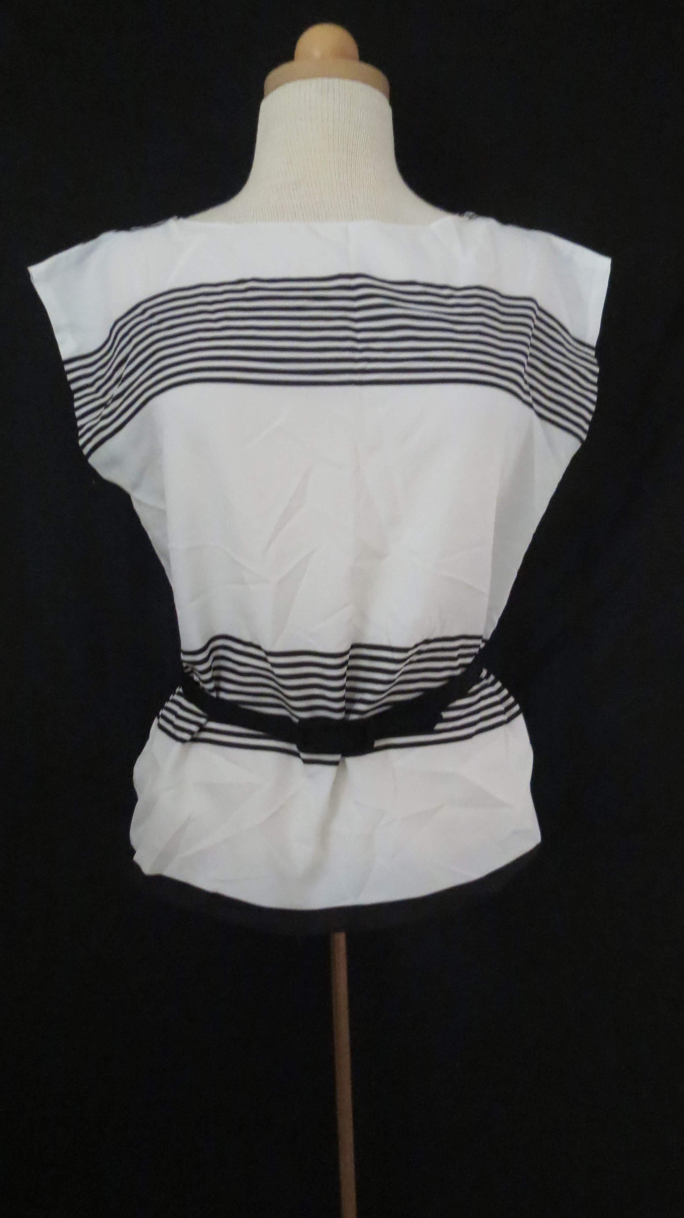 With regard to the style, I love cap sleeves, extended shoulders and bateau necklines – but the neatest thing is that it’s made to wear belted, with little loops sewn in the side seams. The original belt is, alas, missing but I think that it was a slim fabric tie. Easy to replace. For a dressier look, the buckle belt I’m showing in the photo works really well.