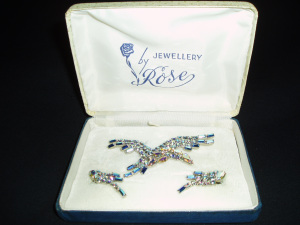 Here’s a pretty matched brooch & earring set in popular aurora borealis rhinestones of the 1950’s. A bird in full flight and little stylized birds for your ears, too. A beautiful …