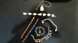 Good with almost anything, a variety of jewelry items for women and men with polished semi-precious stones were really popular in the mid-century. Necklaces, bracelets, pins, sweater clips,cuff lin…