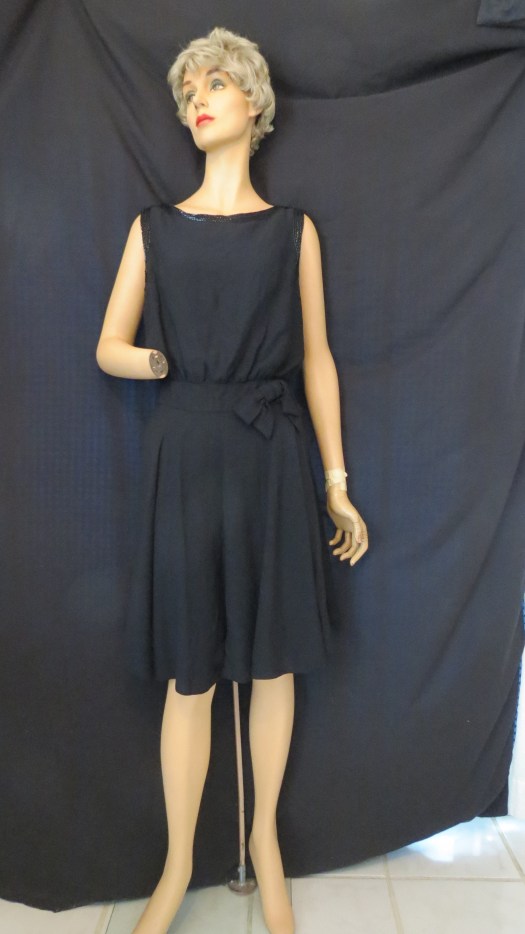 Another pretty, pretty black crepe frock from the mid-century, embellished with bugle beads. Perfect for a cocktail party or a dressy date, etc., etc.,etc. When I tried it on size 2 Stella, it re…