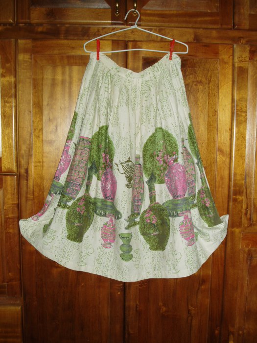 This is SO fabulous! I love this sportswear skirt from the 1950’s with Grecian urns in pretty colors printed all around. In fact, that’s the name of the fabric design, printed on the…