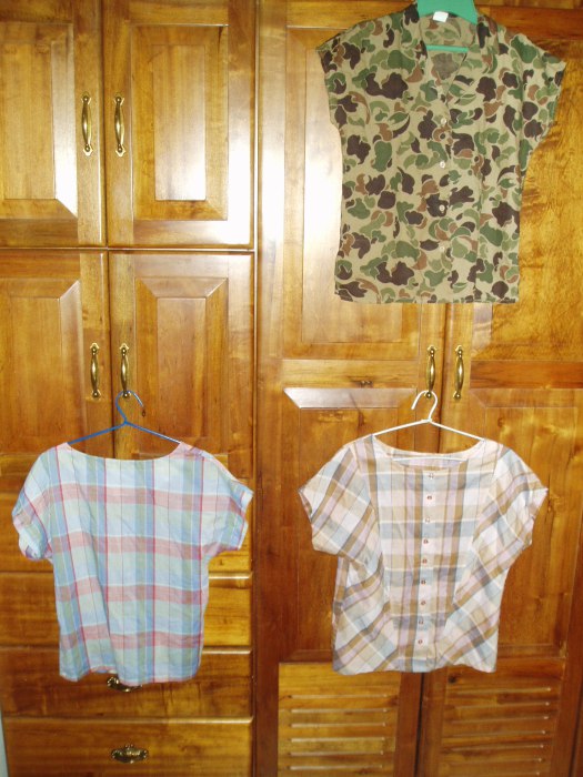 At first, I thought that the green/brown blouse on top was a camouflage pattern – but it’s not. It is a 1950’s art print fabric that is so fun! It was commercially-made, with a …