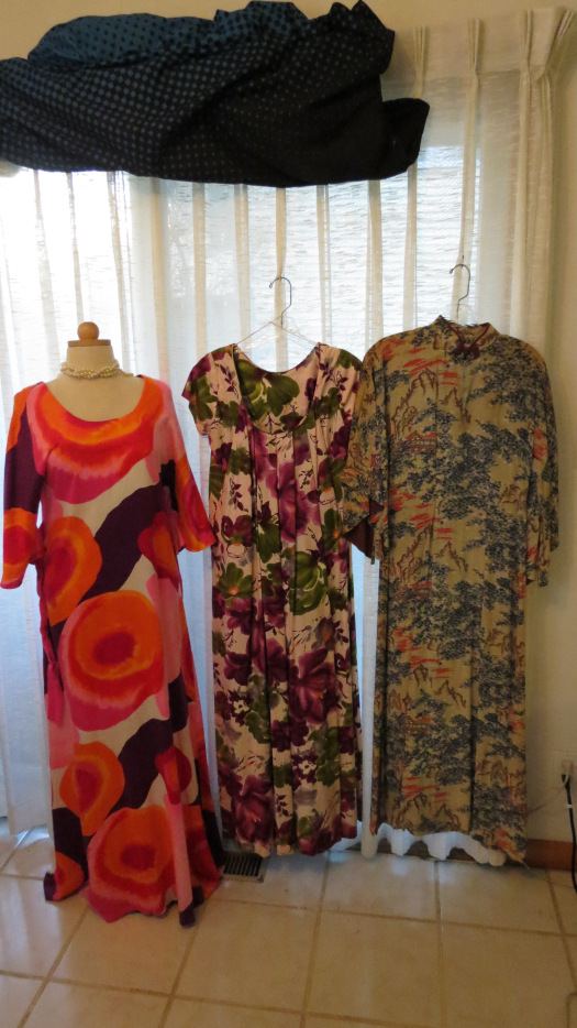 From the 1960’s back to, maybe the 1920’s, these three are my oldest vintage examples of Hawaiian gowns. From the farthest left, to right – Psychedelic hues and patterns on the f…