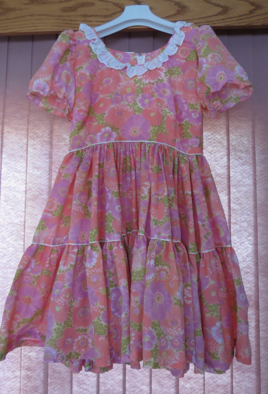 In a ’50’s to early ’60’s style, but with mid-1960’s-type fabric this dress illustrates the creative power that home-sewers in the mid-century had over their wardrobes…