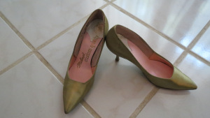 Don’t know if these pieces went together back in the day, but someone probably wore these pale celery green items to a Prom, Homecoming or similar formal dance. I would also want to add a sh…