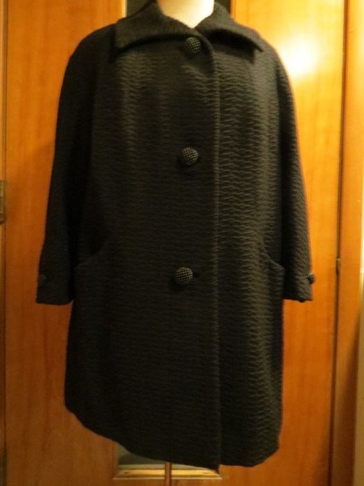 This true vintage beauty from the ’50s or early ’60s was another surprise find. In textured wool, 3/4 length in a swing design (love that), angled pockets, wing collar and a silky sati…
