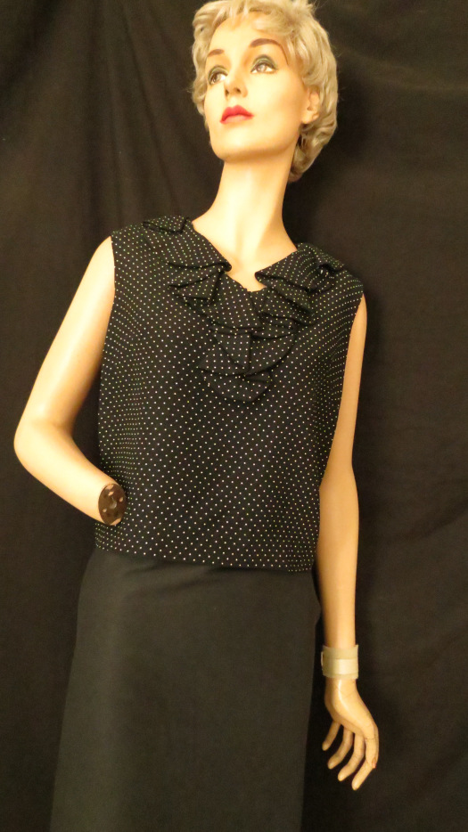 With polka dots, a flouncy neckline and full metal back zipper this rayon & acetate blouse is pure 1950’s – early 1960’s. Can’t wait to wear it with my “new”…