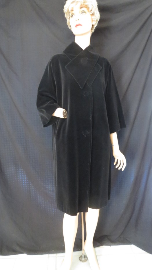 An early 1960’s velveteen “all-weather” coat that I would double as an evening coat! Love the covered buttons and the beautiful attached neck scarf, plus stylish 3/4 sleeves tha…