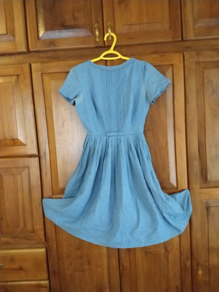 Of exactly the same era (late ’50’s early 1960’s) as the party dress shown yesterday, this comfortable but flirty day-dress is a fabulous find. All it needs is a little bit of color refreshment and one small re-stitching on a seam. Then, off to the State Fair!
