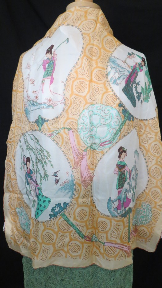 I absolutely love old souvenir scarves and this one doesn’t disappoint. The fabric is a lovely silk, as you would expect, with hand-rolled edges – all the things you would look for in a classic Japanese piece. It’s also of a large size, which makes it more versatile than a headscarf.
