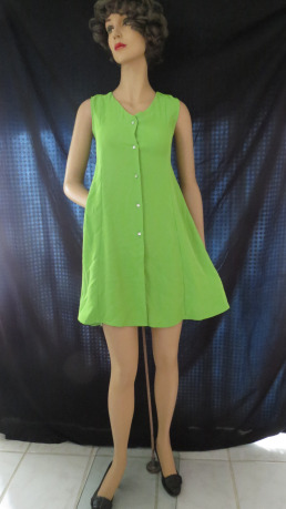 So, here’s a Summer mini-dress for hot days. Non-stop cuteness from the 1960’s in a breezy A-line style, kind of MOD. So easy-wear with adjustable back ties and front button closure.