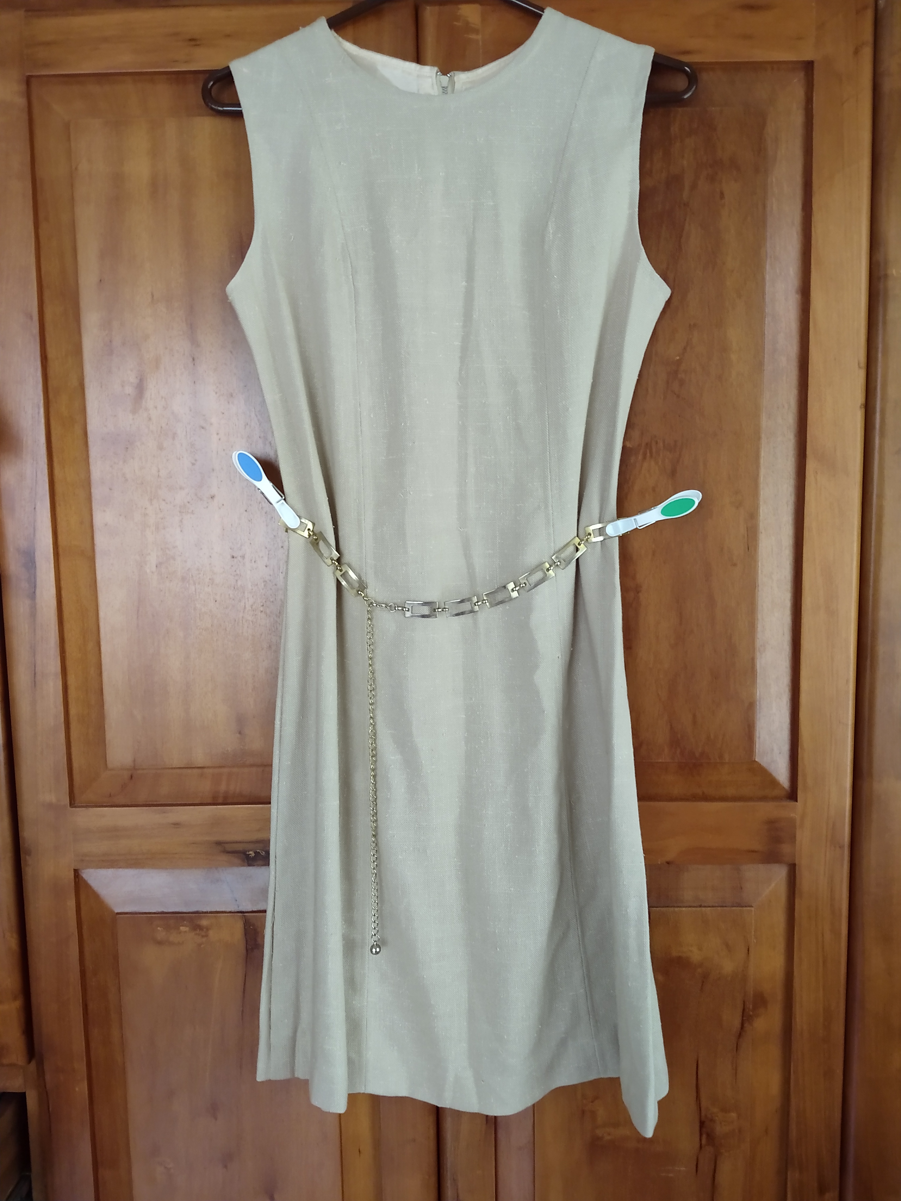 This one is definitely a keeper! The photograph can’t do this dress justice (yes, I really do miss my modeling team) but you, vintage fashion enthusiasts, have the imagination to see it for what is truly is. I’m showing it here with a recently-discovered chain belt which is a perfect accessory in the Sixties style.