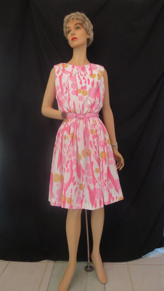 Here’s one of the loveliest examples of a Kennedy-era day dress I’ve found. The special characteristics that stand out here are the bubbly, happy print and the “whipped cream” texture of the synthetic fabric. They’re features identified with those few years surrounding John’s and Jackie’s “Camelot” and not often done as well since then. Women’s clothing between about 1955 and 1965 combined the elements of feminine style and fun in really wonderful ways.