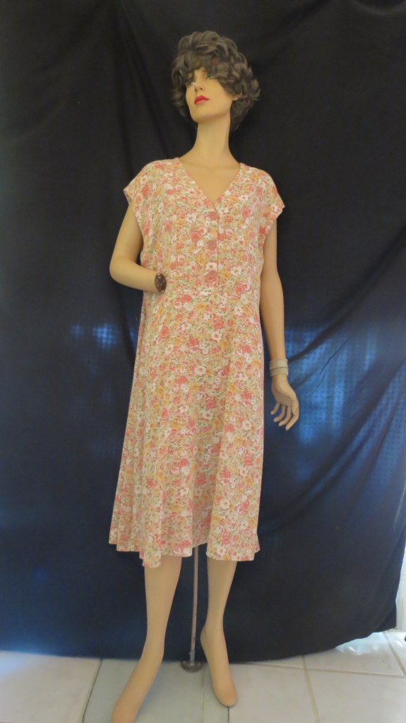 I was fortunate, another time, to find a true vintage dress in a large size. This time it’s also much older – dating from the 1960’s to early 1970’s, but the buttons are probably from the 1940’s or Fifties. Needless to say, it’s a home-sewn garment; very simply- but well-made. The good construction also speaks to its age because most women stopped sewing clothing after the Seventies and lost their skills. The fabric is pretty but not high-quality. If you can zoom in on the buttons, they are the best part of this dress, to me, aside from the true vintage heritage.