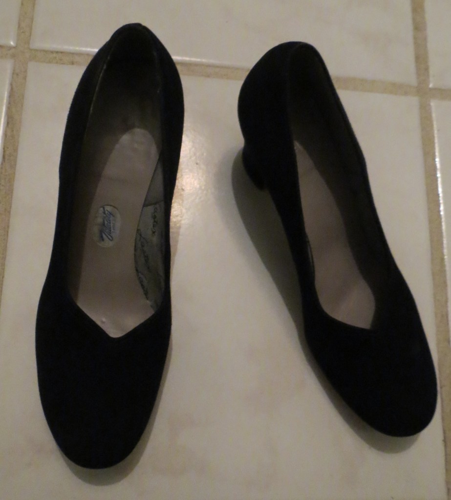 The pair on top, with the vamp decoration, alas was too small for me. But, this second pair goes so well with my wartime and mid-century day and house dresses. I love wearing them all the time. Even love the brand name: Vitality!