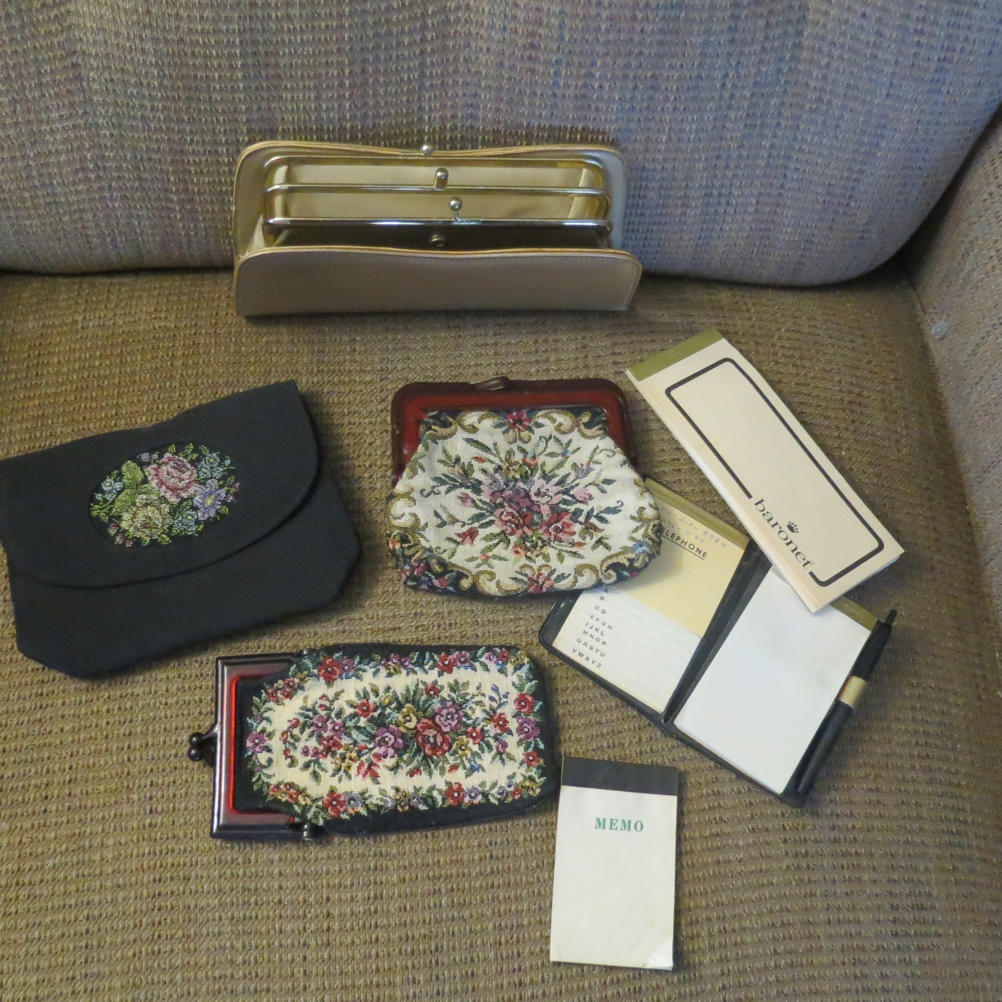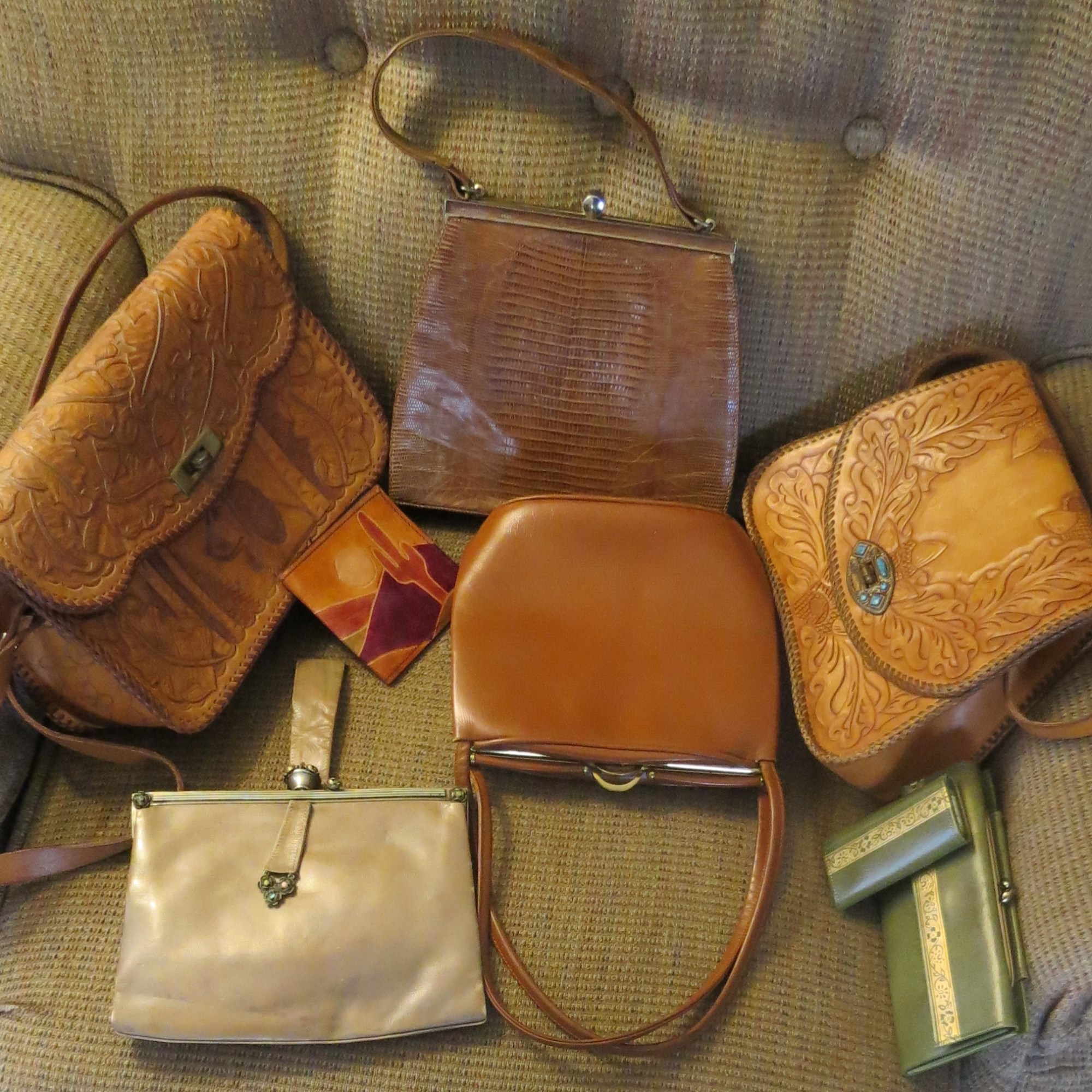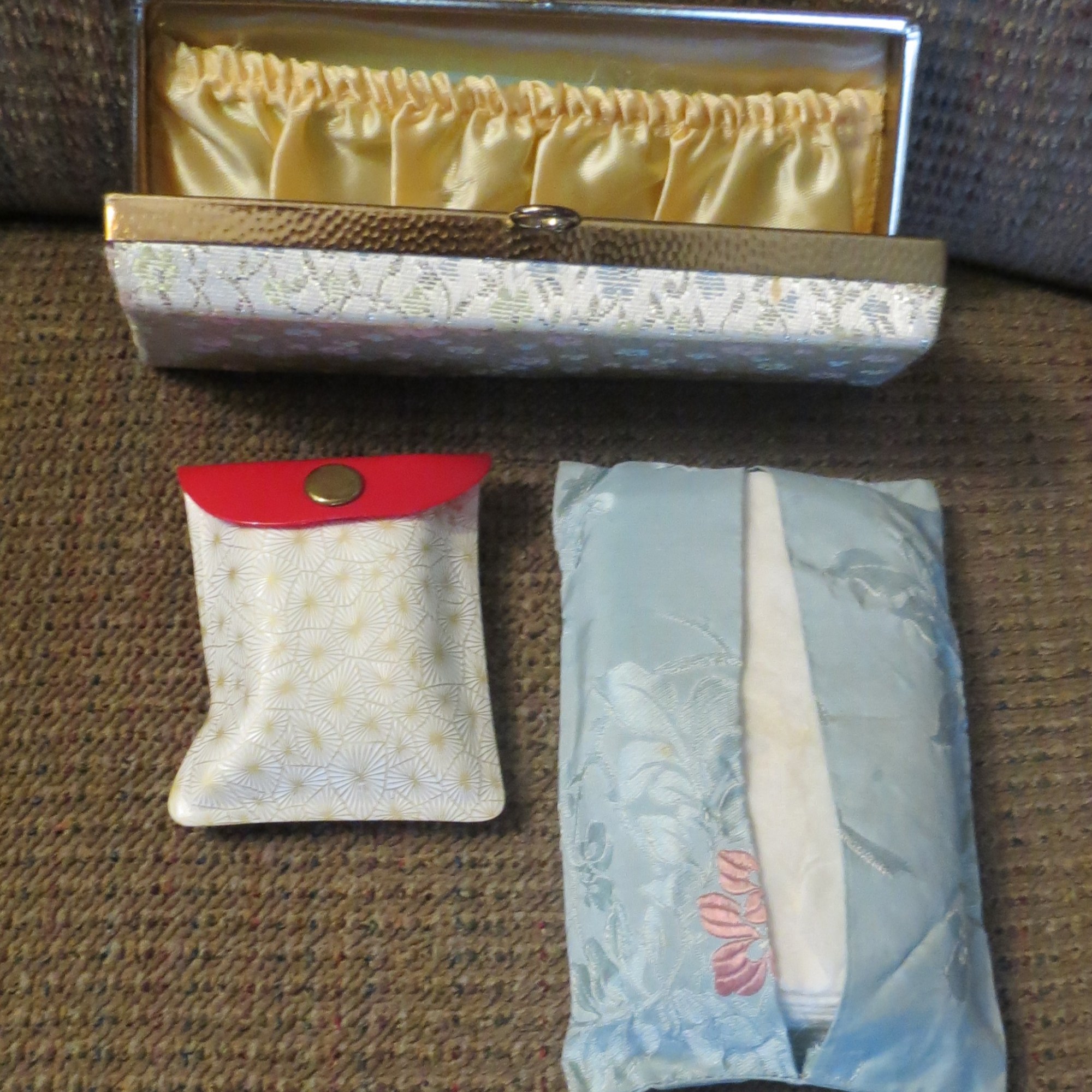 I THINK I’ve got it all done. From the 1930’s through the 1960’s these bags, some handmade (I LOVE hand-tooled leather) and the little accessories that women used to carry were so much fun to sort through again. A fine leather billfold with matching key-case. A tapestry-look eyeglass or cigarette case. A padded silk holder for a few tissues. Little pads for organizing phone numbers (with attached pen) or writing little notes. A plastic rain bonnet folded up in a plastic case and distributed by a local funeral home.