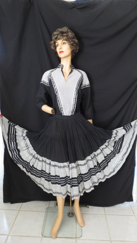 How about a little break from the coats right now? I promise, there will be more coming. 2 piece dresses like this were all the rage in the early mid-century and many women who lived in the Southwest United States or had the leisure to travel there had a dress like this hanging in their closet. The color combos varied across the spectrum and this black and gray one is somewhat unusual.