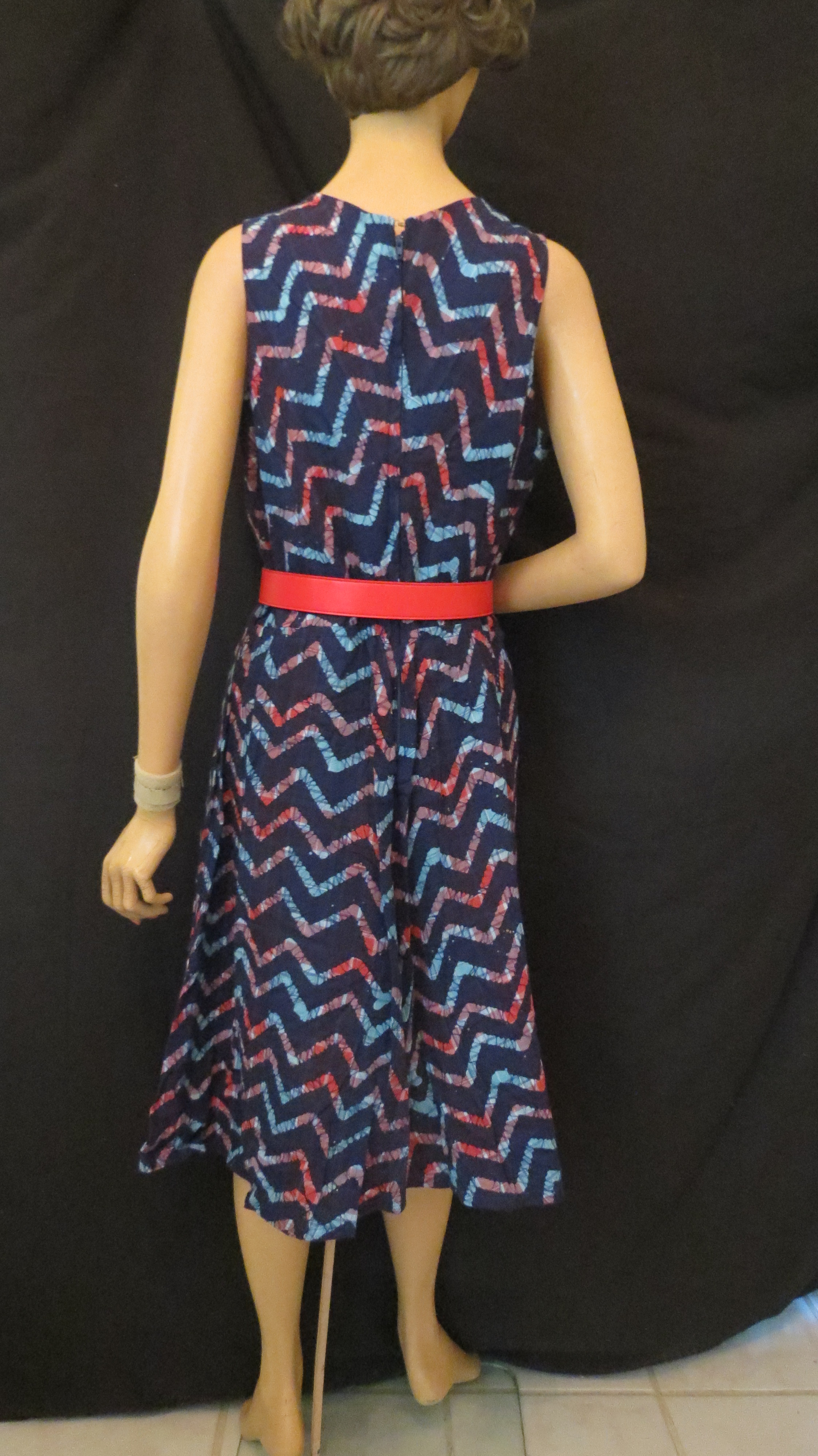 Once we get past the turn of the 1950’s to ’60’s decade, boy – do styles really start to change! This one is maybe a little more adventurous than the norm because it was custom-made. Compared to the dress from yesterday, the style is free and easy. There’s a V-neckline and fuller skirt though the below-knee hemline remains, but without stiff tailoring or crinoline layers underneath like so many of the Fifties frocks. The print, colors and belt say “Look at me!”.