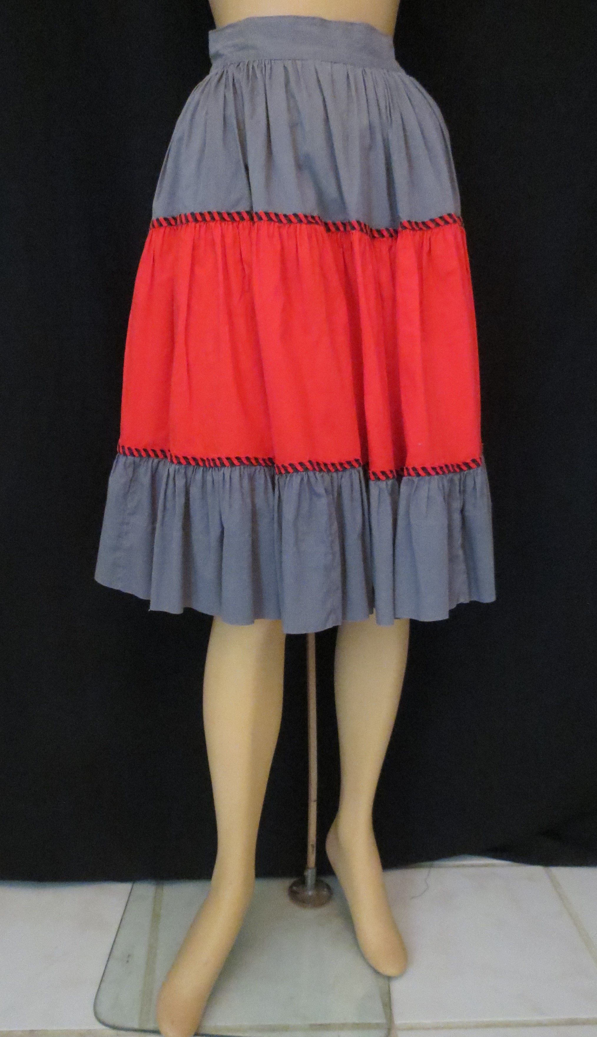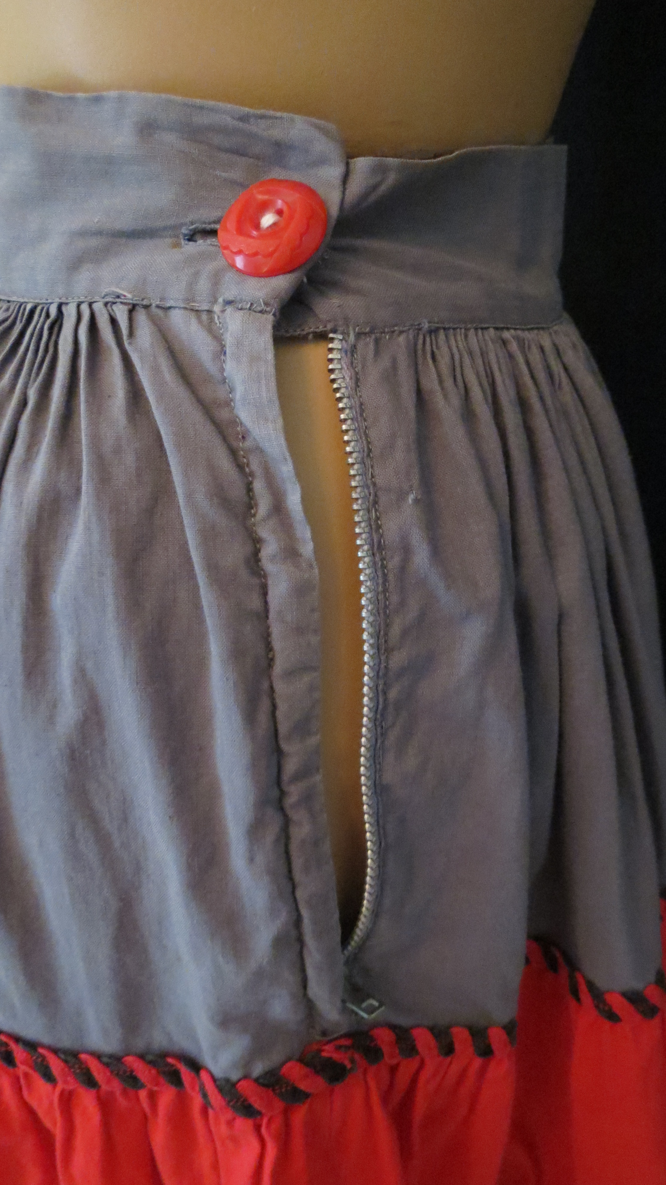In an unexpected place, this was my first find. A full circle, this skirt is pure fun. From the carved button to the barbershop braid to the bright red tier it might have been worn with a peasant blouse in the 1940’s, the 1950’s or even the early 1960’s. Home-based seamstresses used to use notions from their stockpile of previous years, so the button, zipper, braid and even the fabric could have been from years before this garment was actually made BUT, all things considered, I place this skirt in the post-war 1940’s or early to mid-1950’s.