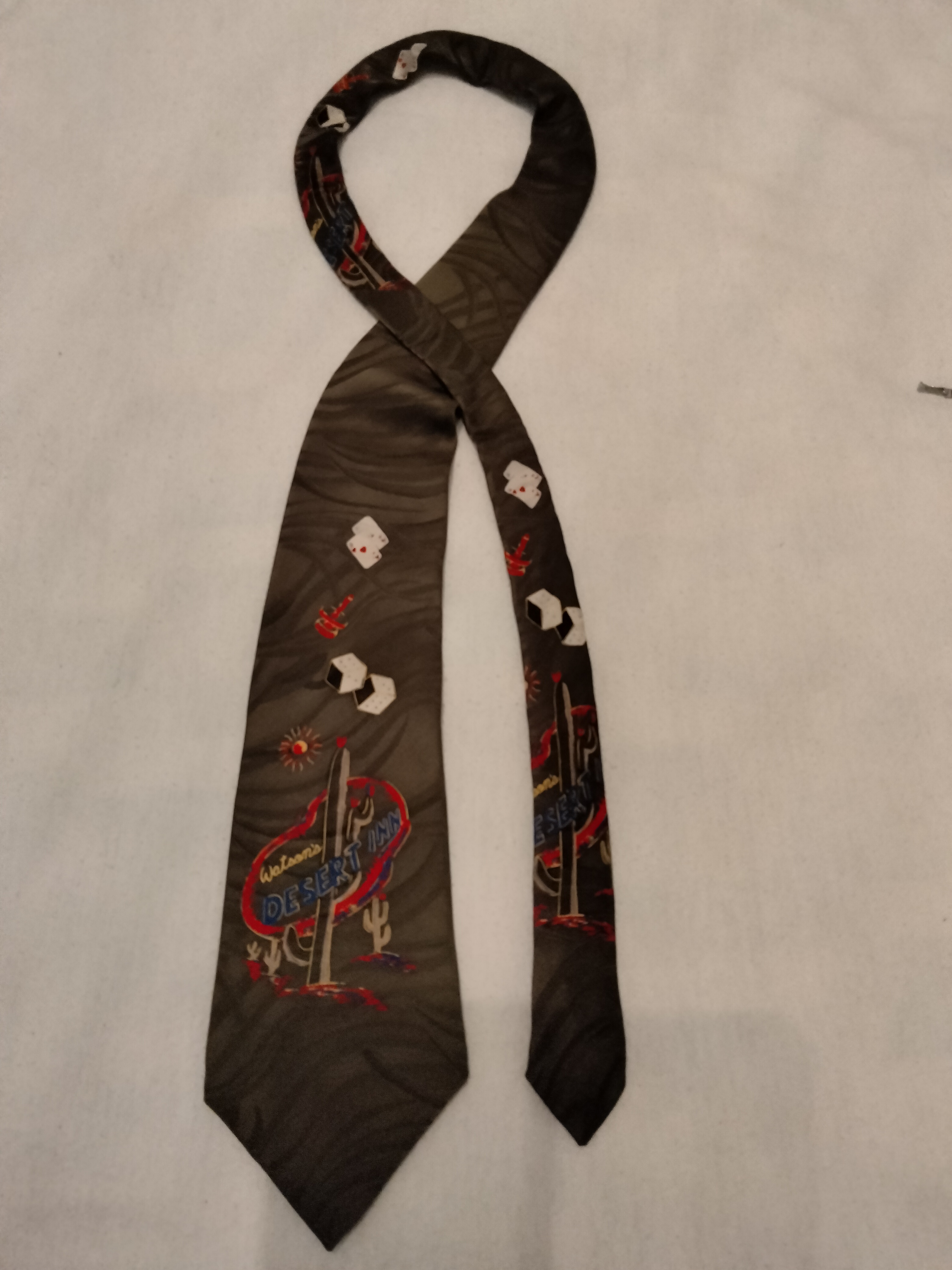 The tie is the man’s equivalent. Made in a great attempt to reproduce a 1950’s version, this 100% silk tie is probably from the early 1980’s. Like so many wonderful kitschy wardrobe items, it was likely acquired during a vacation. Watson’s Desert Inn is/was on Canary Island, and now may have disappeared. The tie, however, is very well-made and has great design harking back to the 1950’s Las Vegas era. Take a zoom in to examine the illustration. As with many items purchased at travel destinations, it looks as though it was never used. Perfect!