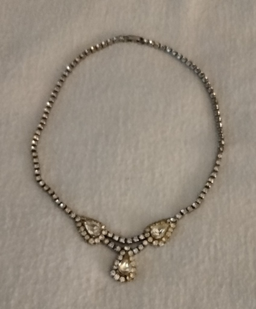 Classic costume rhinestones, in a “formal event” necklace. I’ve found a number of these, so why did I decide to collect this one? It’s got to do with the details: hardly a high-end piece, this bit of paste jewelry was made for the common market. It’s very sparkly (the photo doesn’t do it justice) but has a minor flaw or two in the construction. It’s all cool because this necklace appears to be from the 1940’s or 1930’s and would have been a special element of some woman’s jewel box. I can probably correct the flaw with small tools.