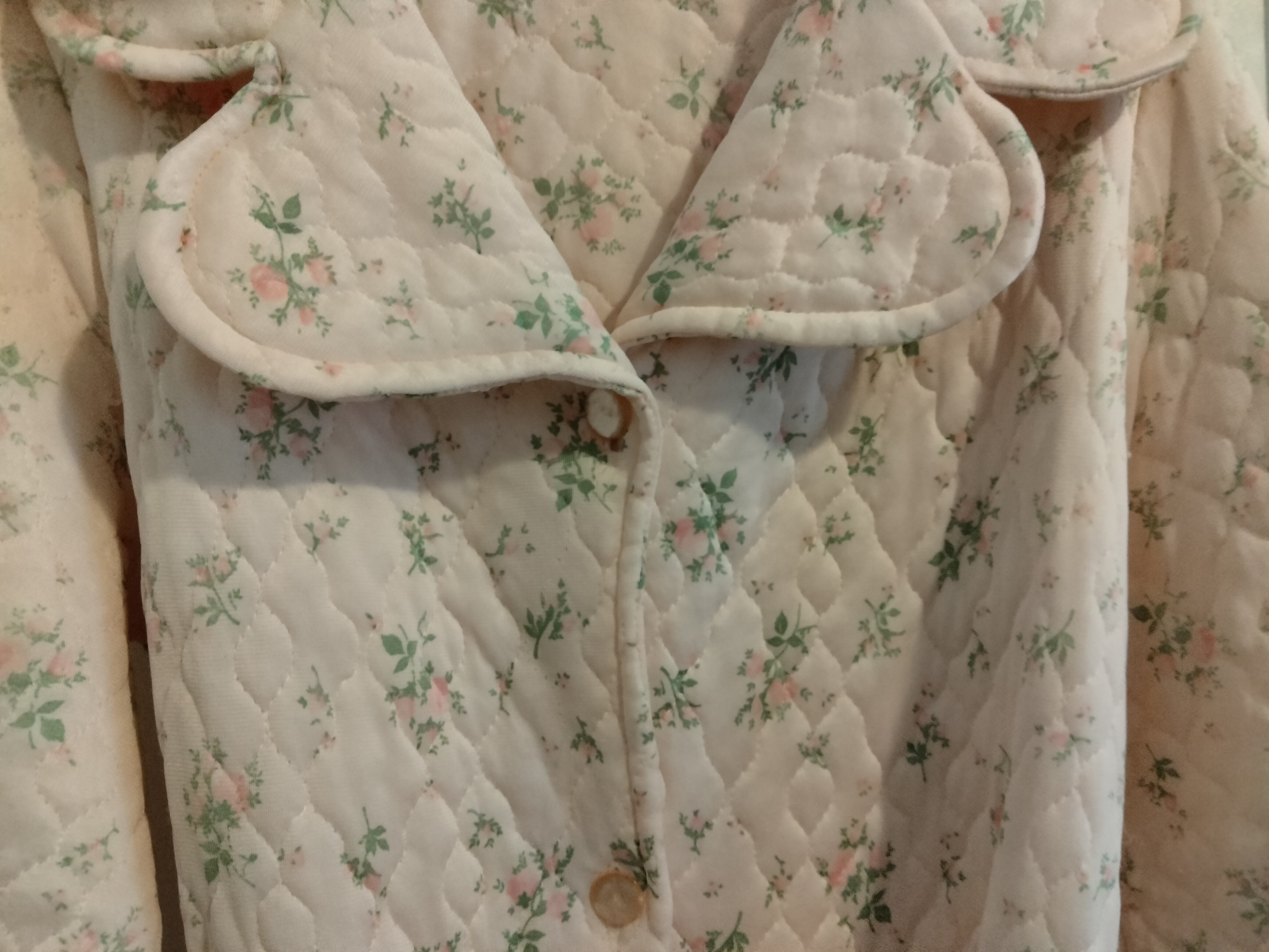 Out and about at a small estate sale it was fun to browse, but not much of interest until I spotted this mid-century quilted bathrobe. It’s not glamorous, it’s not a Star, but it IS a PERFECT example of a garment which almost everyone’s grandma or great-grandma may have had in her closet in +/- 1950! No doubt it came from an everyday bargain store like Spurgeons, J.C. Penney, Montgomery Ward or Sears & Roebuck. Alas, there is no remaining label, if there ever was one. The scalloped collar hints at the 1940’s, buttons to the mid-calf (modesty covered!), the 3/4 sleeves and tiny rose print were common at various times during wartime and the next 20 years and the pearlized pink plastic buttons with stems are SO Fifties. It’s also in great shape.