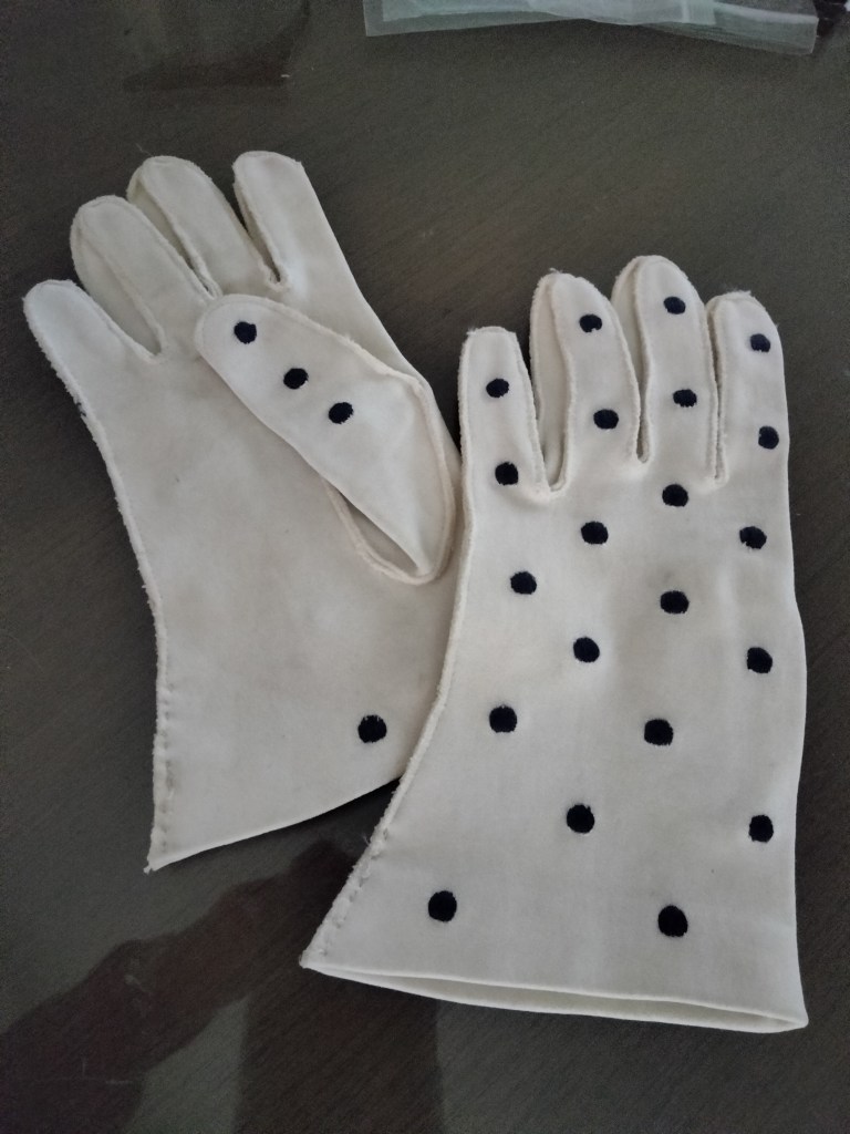 What makes these so fun and special is the decoration. In place of being printed on the fabric, you can see that each little polka-dot has been appliqued’ (stitched on) by hand. Hard to know whether they were sold this way since no label or brand name is present, as would usually be the case with best-quality makers; this leads me to wonder if the gloves were a more modestly-priced (though nicely-made) brand that a thrifty and crafty gal bought and used her skills to decorate by herself!